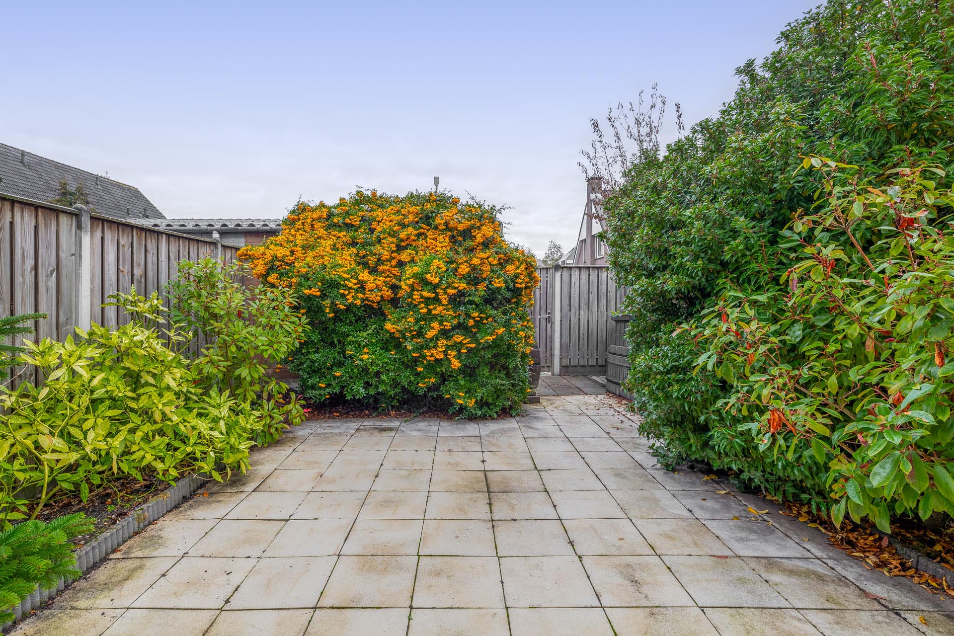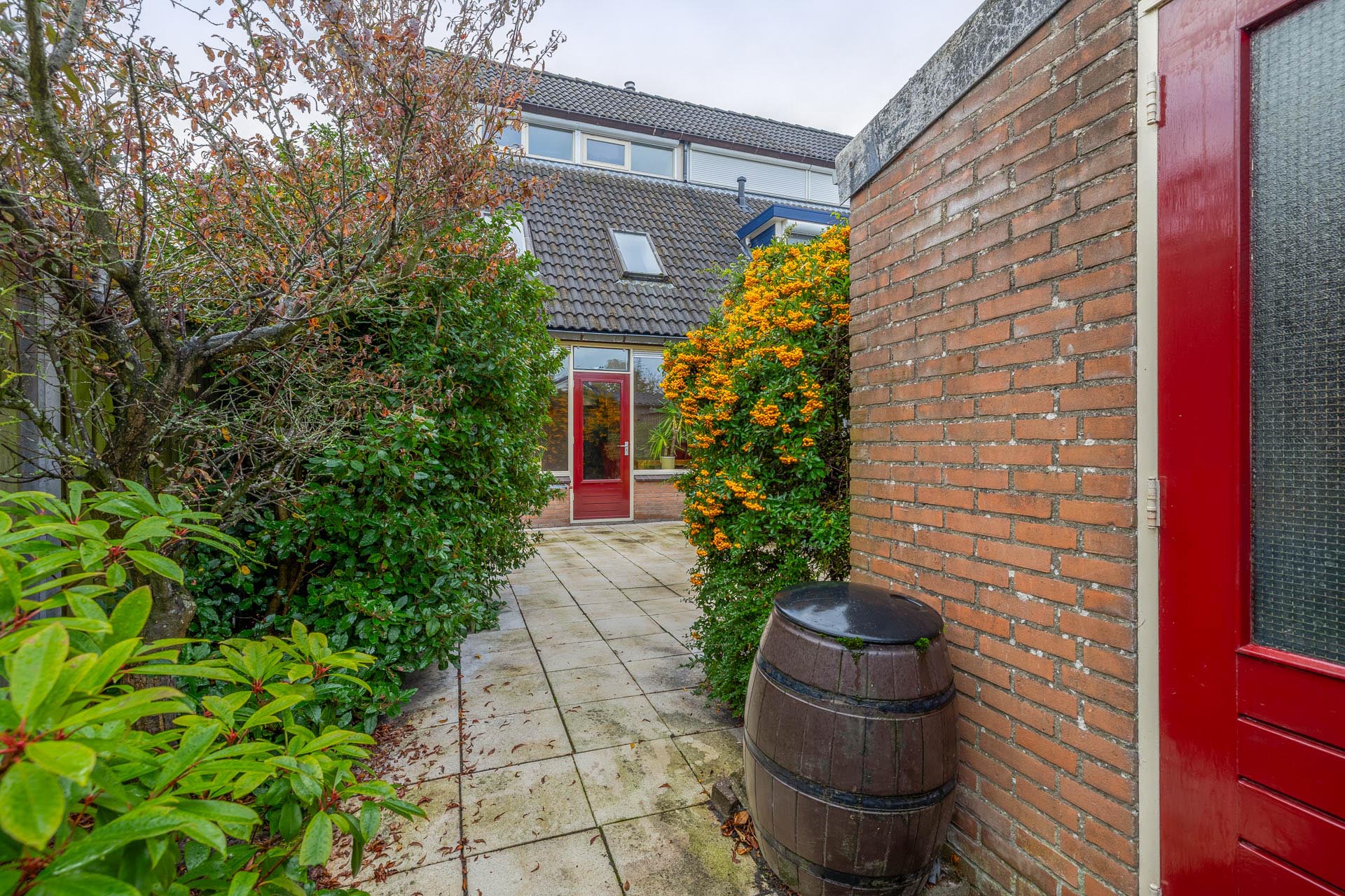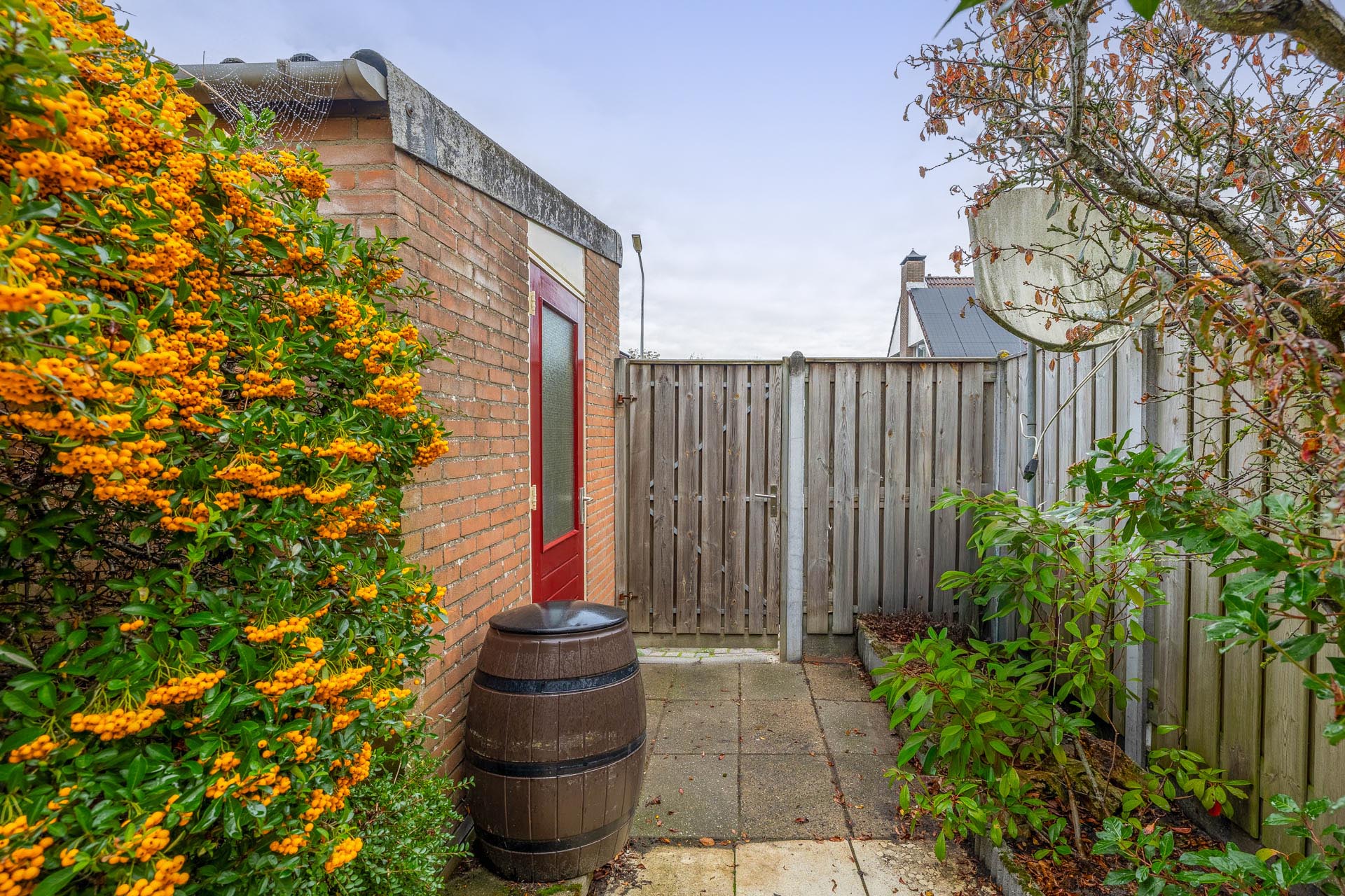 De achtertuin, gelegen op het noorden, is grotendeels voorzien van bestrating en daardoor onderhoudsarm. Aan beide zijden is de tuin voorzien borders met allerlei mooie planten en struiken. Achter in de tuin staat de stenen berging. Naast de berging is een houten poort waardoor de tuin achterom bereikbaar is.