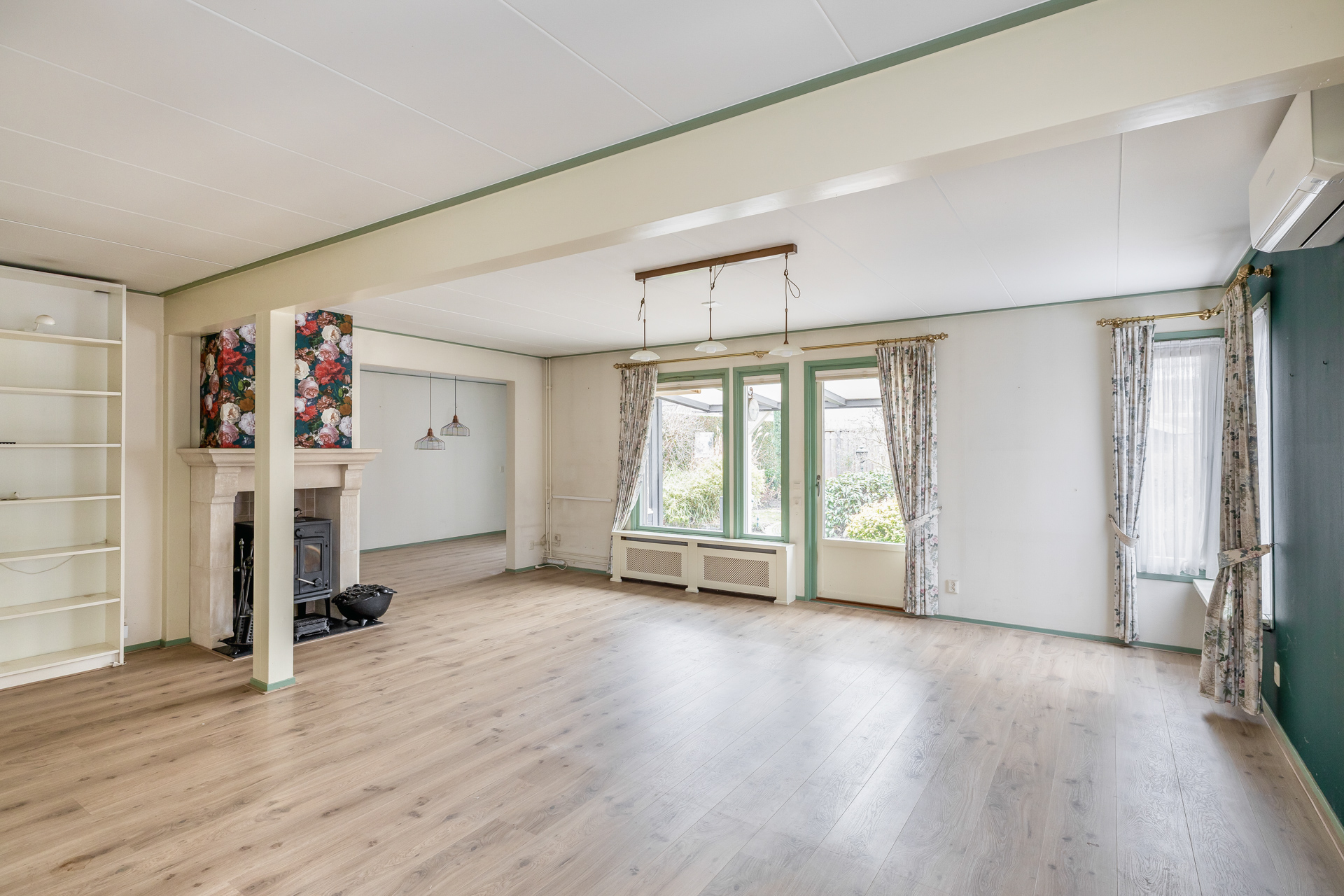Via de entreehal, voorzien van meterkast en toilet, betreed je de ruime woonkamer met aangrenzende zitkamer en open keuken. De diverse raampartijen zorgen voor een prettige lichtinval en de houtkachel nodigt uit tot gezellige avonden tijdens de koudere maanden van het jaar. De open keuken is aan de voorzijde van de woning gesitueerd en uitgerust met inbouwapparatuur. Vanuit de woonkamer loop je direct het terras met overkapping op, waar binnen en buiten harmonieus samenkomen. Vanuit de zitkamer is er toegang tot een praktische berging, wat zorgt voor extra gebruiksgemak. Zowel op de begane grond als de eerste verdieping is airconditioning aanwezig, wat bijdraagt aan een aangenaam woonklimaat in elk seizoen.