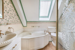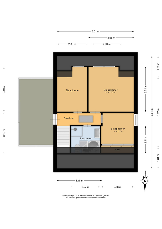 De eerste verdieping beschikt over drie comfortabele slaapkamers en een badkamer. De dakkapel aan de achterzijde vergroot het wooncomfort en zorgt voor extra ruimte en licht in de slaapkamers. De badkamer is compleet uitgevoerd met een ligbad, douche, toilet en een wastafelmeubel met waskom. Daarnaast bevindt zich op de overloop een vlizotrap naar de vliering, een praktische ruimte voor extra bergruimte.