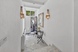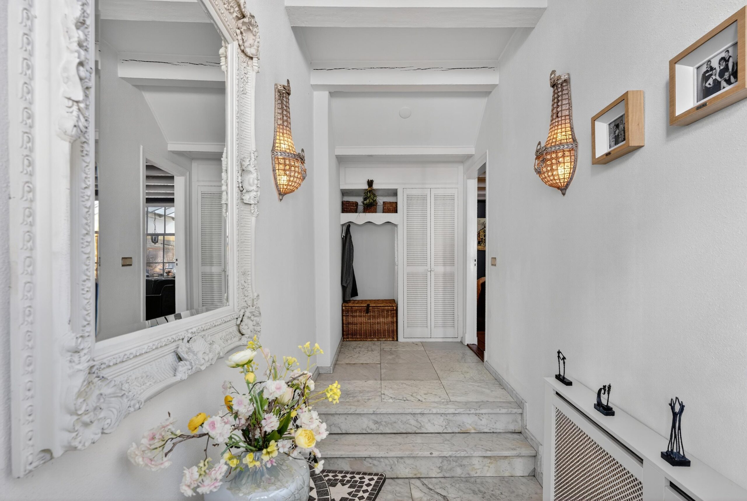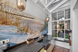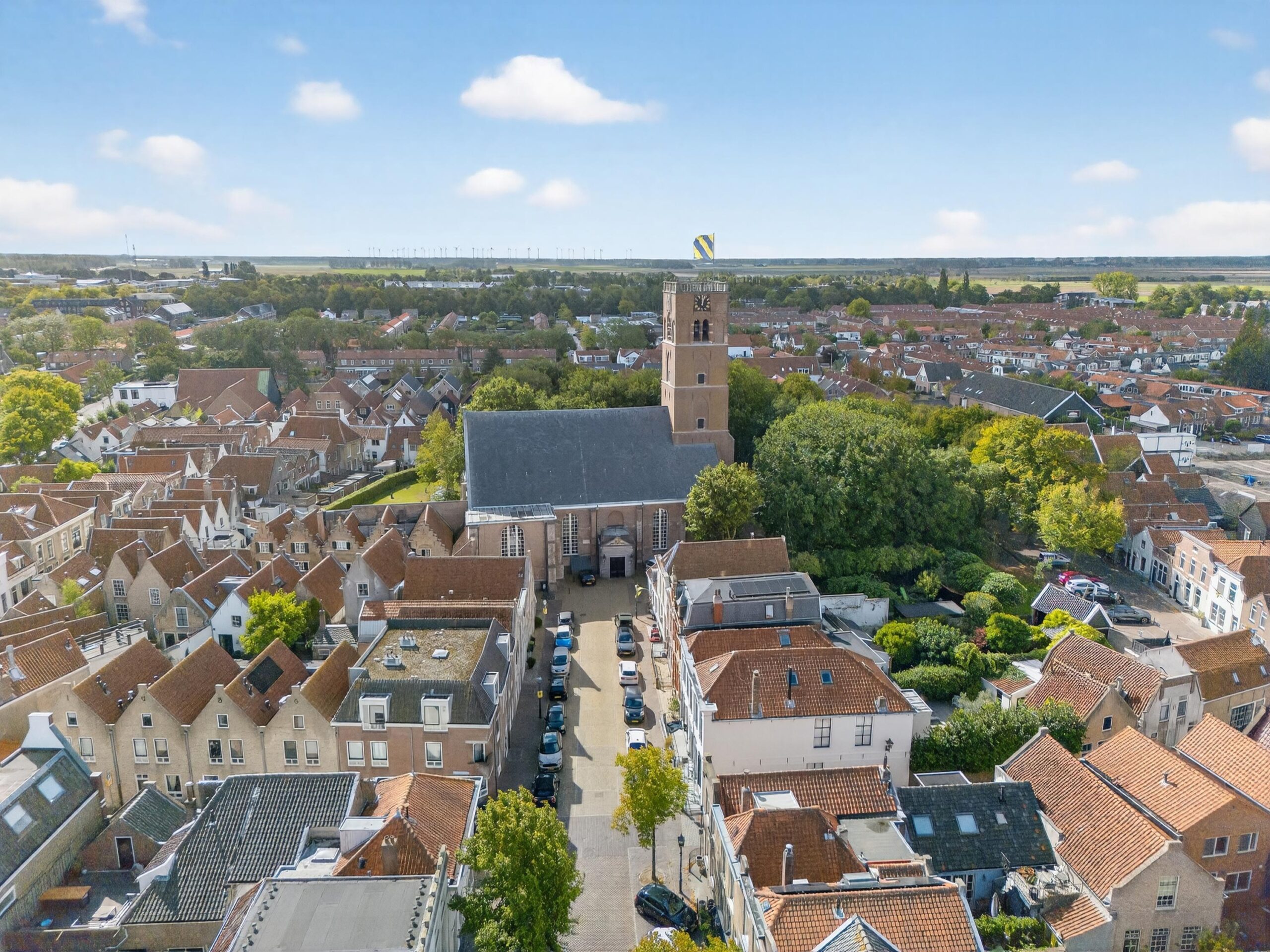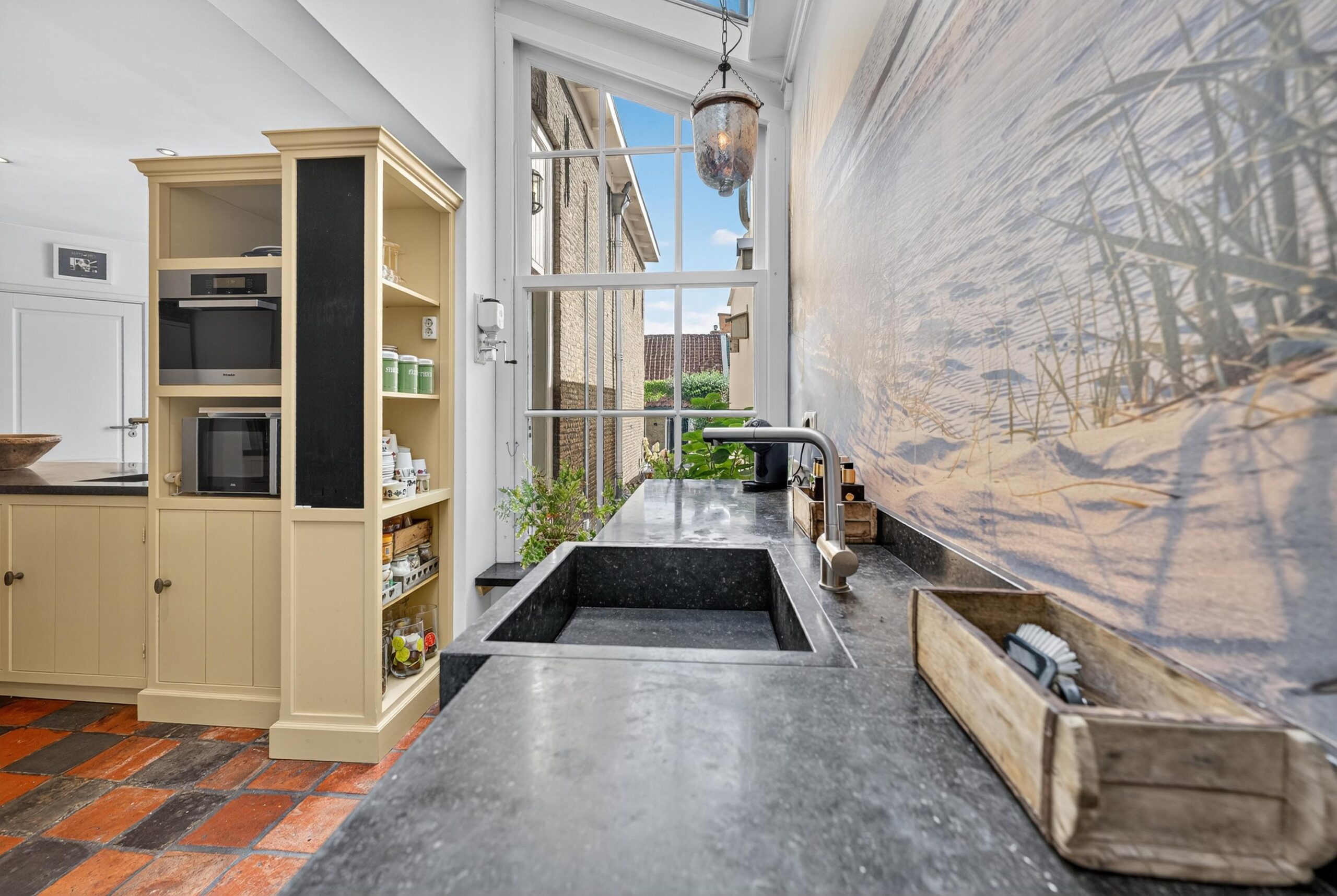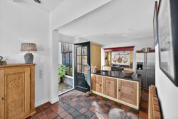 Wanneer u de Voorstraat oprijdt, voelt u de rijke historie van deze straat met zijn vele authentieke panden – waaronder deze prachtige woning. Bij binnenkomst komt u in de lichte entreehal, die toegang geeft tot de sfeervolle woonkamer. Het balkenplafond en de open haard maken het hier heerlijk comfortabel en uitnodigend. Vanuit de woonkamer bereikt u via een tweede hal de open keuken met eetgedeelte. In deze tweede hal is er ook toegang tot de toiletruimte. De landelijke keuken is knus en licht, mede dankzij het deel dat in de serre is geplaatst, en biedt uitzicht op de sfeervolle achtertuin. De keuken is voorzien van een spoeleiland en moderne apparatuur: gasfornuis, afzuigkap, combi-oven, koelkast, vriezer en vaatwasser. De tegelvloer sluit perfect aan bij de warme uitstraling van de keuken en het achterste deel van de keuken is voorzien van vloerverwarming. Grenzend aan de keuken vindt u de eetkamer – een fijne plek om met familie of vrienden uitgebreid te dineren, in klein of groot gezelschap.