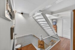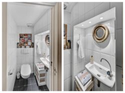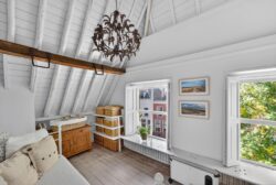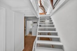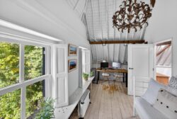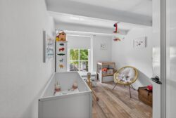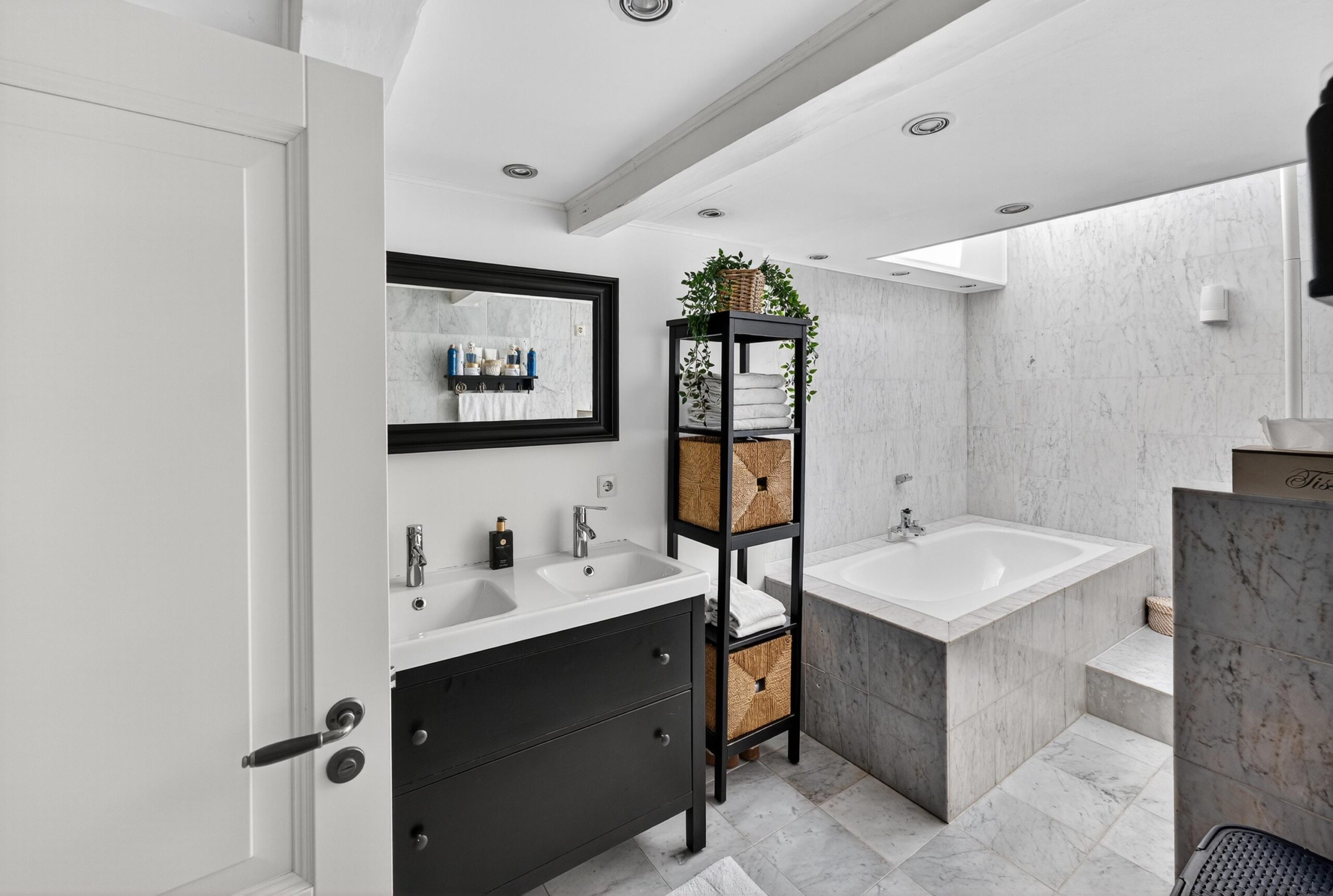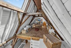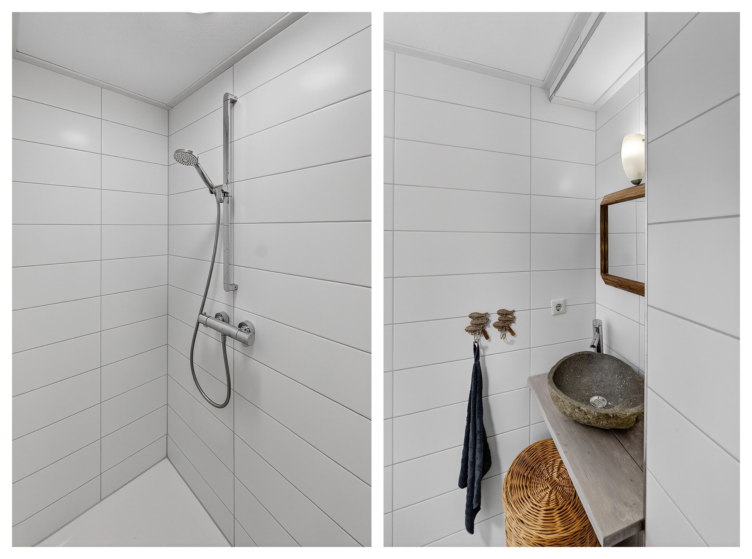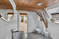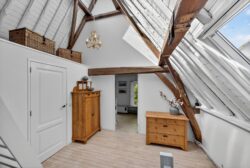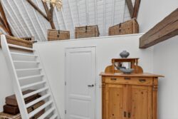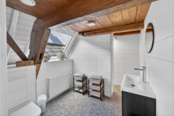 Een vaste trap leidt naar de tweede verdieping, waar nog eens twee verrassend sfeervolle slaapkamers en een inloopkast wachten. Het zichtbare hout van de balken geeft de kamers een natuurlijke, warme uitstraling. Vanaf de overloop bereikt u een vide, momenteel ingericht als kantoorruimte – een charmante werkplek hoog in de nok van het huis. Ook op deze verdieping vindt u een badkamer, compleet met inloopdouche, toilet en wastafelmeubel. De granieten vloer zorgt voor een luxe, spa-achtige sfeer en maakt het geheel af.