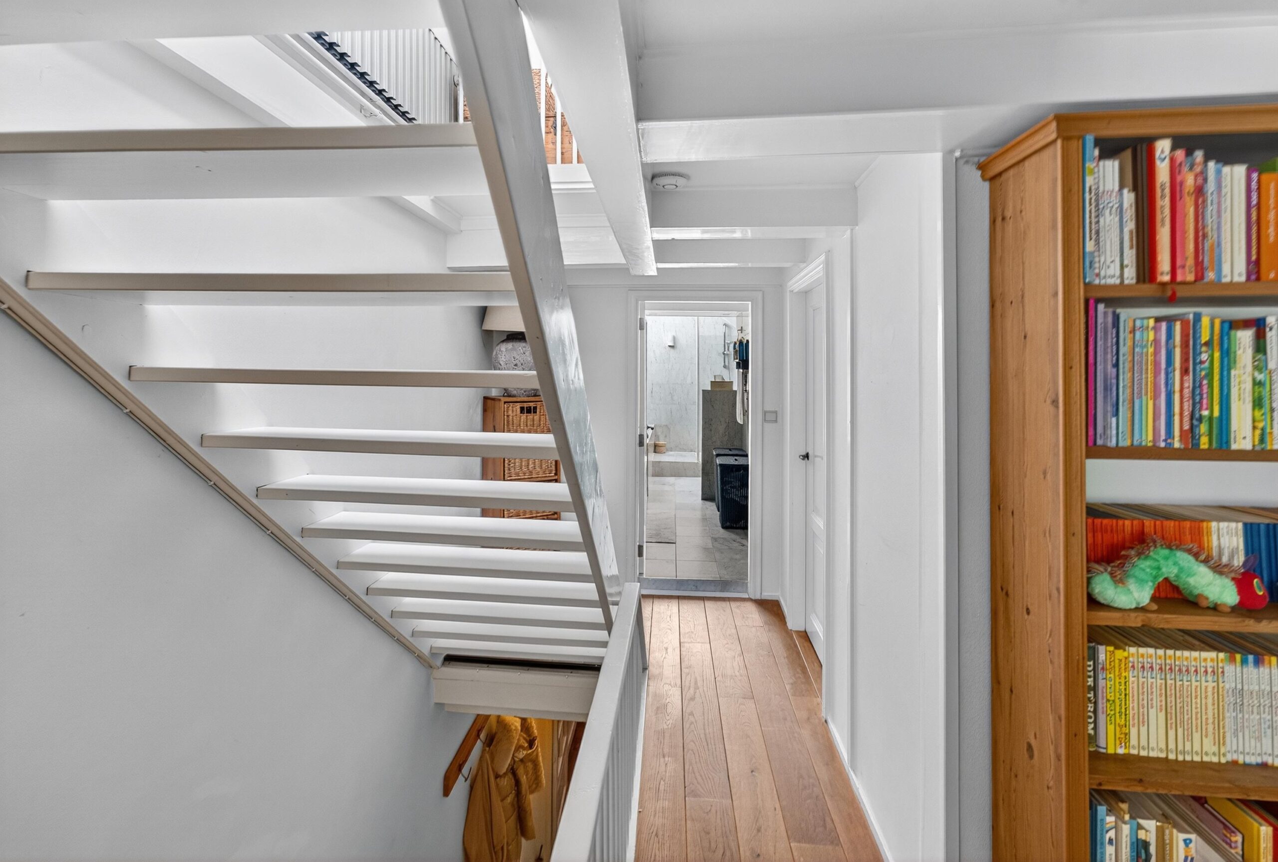Zowel vanuit de keuken als ter hoogte van de woonkamer leidt een vaste trap u naar de eerste verdieping. Hier vindt u vier sfeervolle slaapkamers, elk met lage ramen die zorgen voor een mooie, zachte lichtinval. De slaapkamer aan de achterzijde, bereikbaar vanuit de keuken, is voorzien van een dakraam in het schuine dak en biedt toegang tot de badkamer met inloopdouche en wastafel.
