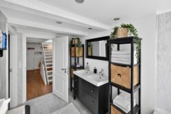 De trap aan de voorzijde van de woning brengt u naar een ruime overloop, van waaruit u drie extra slaapkamers bereikt. Ook deze kamers stralen warmte en gezelligheid uit, en één kamer beschikt over een royale inbouwkast. De tweede badkamer is compleet en luxe uitgevoerd met ligbad, inloopdouche, toilet en een dubbele wastafel met meubel – ideaal voor een ontspannen start van de dag.