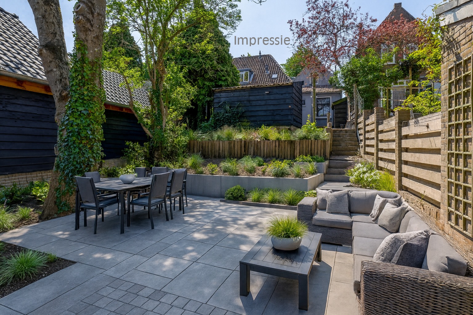 De diepe tuin loopt in de lengte richting water en is gelegen op het noorden. Het terras aan het water zorgt voor momenten van rust. In de tuin staat een vrijstaande, houten berging.