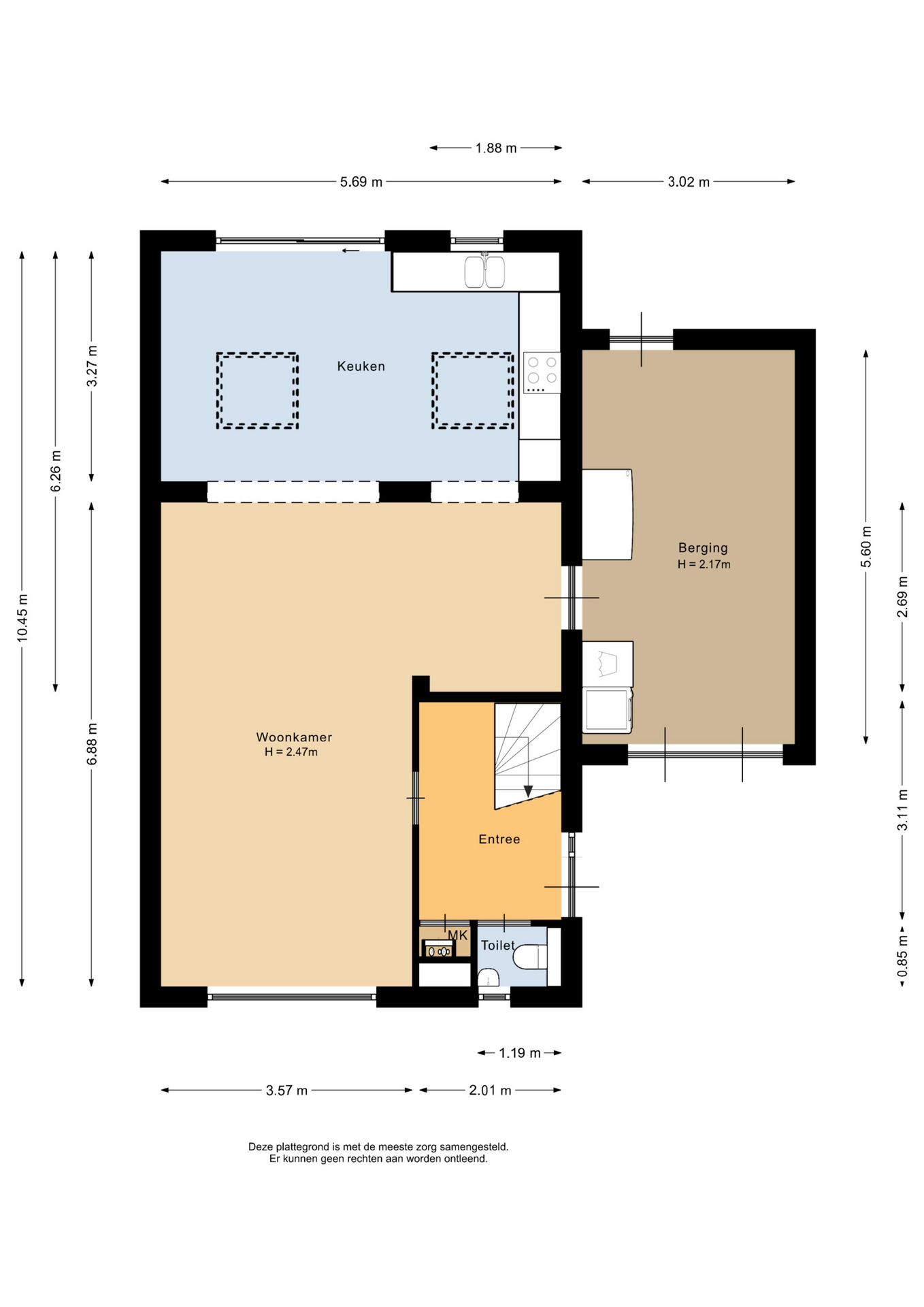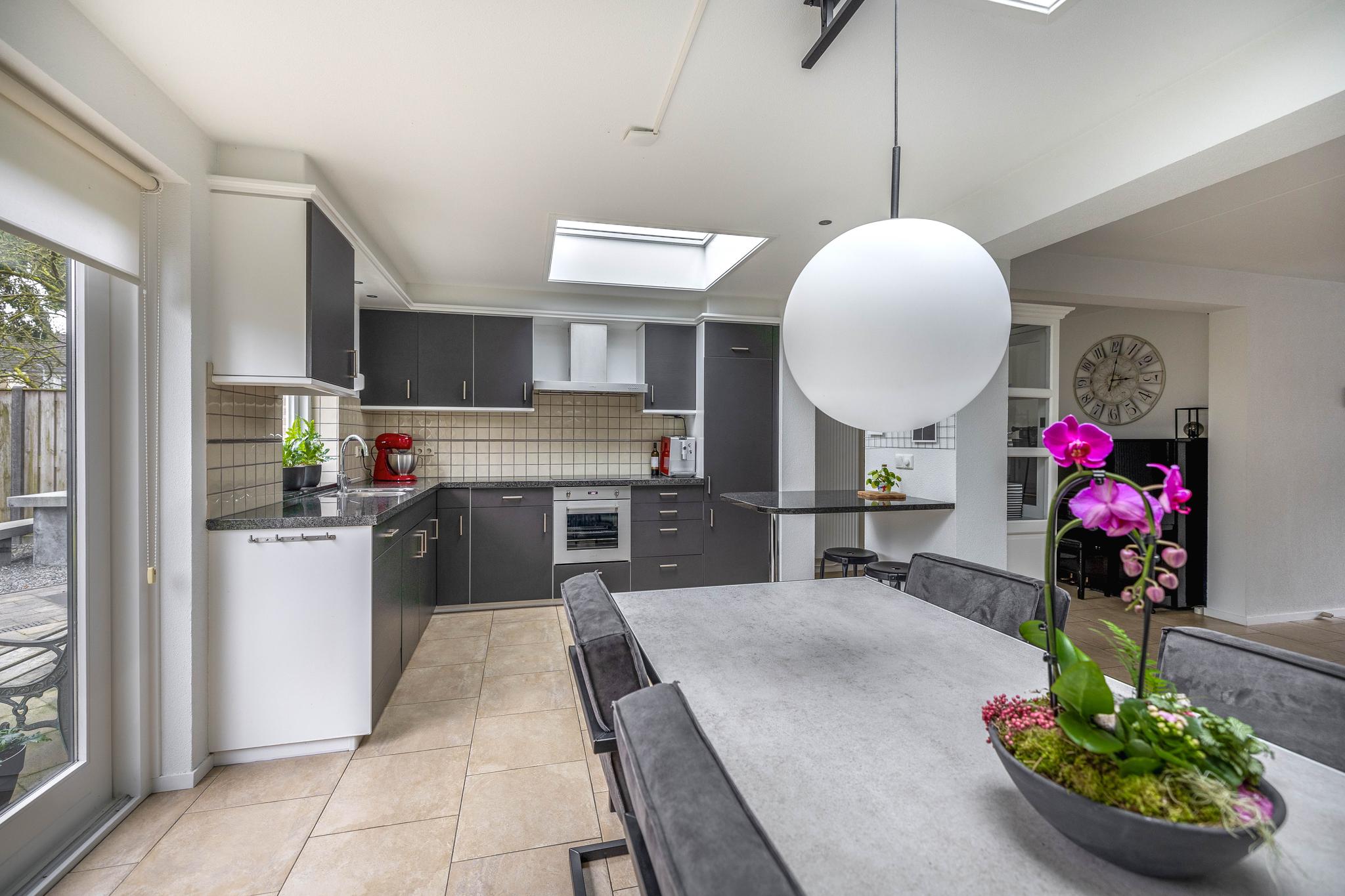 Vanuit de entreehal, met meterkast, toilet en trapopgang, zijn de woonkamer en ruime leefkeuken bereikbaar. De woonkamer is aan de voorzijde van de woning gelegen en is voorzien van een groot raam wat zorgt voor veel lichtinval. Aan de achterzijde van de woning is de leefkeuken gesitueerd. De leefkeuken is voorzien van twee lichtkoepels. De hoekkeuken is voorzien van veel opbergruimte en diverse apparatuur: kookplaat, spoelbak, afzuigkap, koelkast en vaatwasser. Vanuit de woonkamer is de berging bereikbaar. De berging, met plavuizen vloer en witgoedaansluitingen, geeft toegang tot de tuin. De gehele begane grond is voorzien van een plavuizen vloer met vloerverwarming.