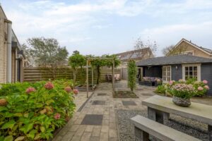 De mooie, verzorgde achtertuin, gelegen op het noordoosten, is voorzien van bestrating, borders met allerlei planten en struiken. Achter in de tuin staat de mooie overkapping met berging en prachtige robuuste vuurhaard. Het is hier heerlijk vertoeven, de schutting zorgt voor veel privacy. Op de oprit is voldoende plaats om uw auto te parkeren.