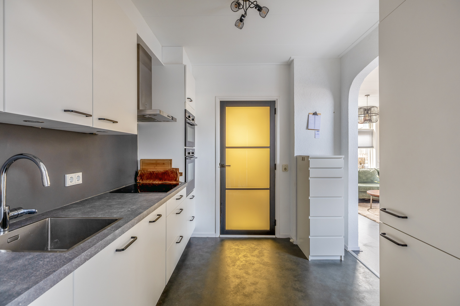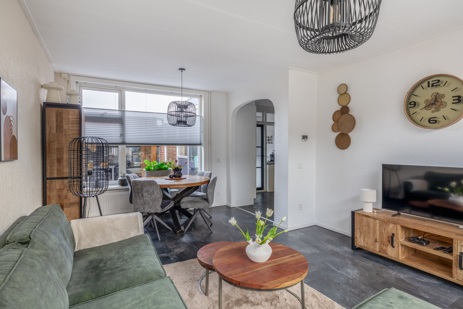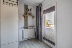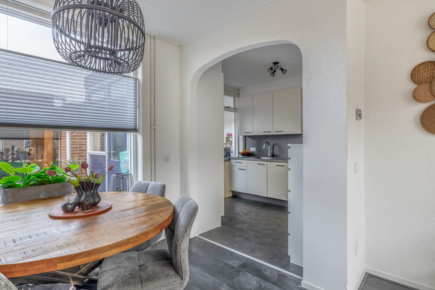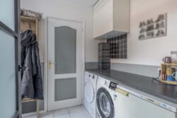 Via de hal loop je door naar de open keuken, die in directe verbinding staat met de woonkamer. De woonkamer is praktisch en overzichtelijk ingedeeld en biedt voldoende ruimte voor een gezellige zithoek en eethoek. Vanuit de keuken bereik je de bijkeuken, ideaal als wasruimte. Deze ruimte geeft toegang tot de berging en de tuin, wat zorgt voor extra gebruiksgemak. De woning is volledig geïsoleerd, wat bijdraagt aan een comfortabel binnenklimaat.