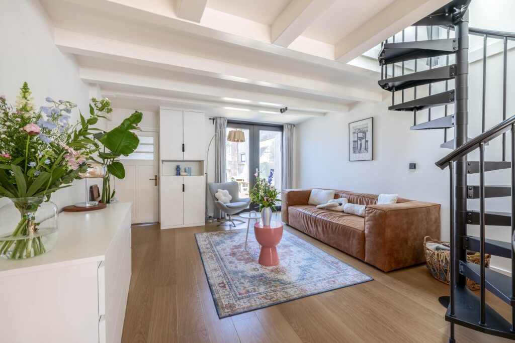 De entreehal geeft toegang tot de woonkamer met open keuken. De woonkamer, gelegen aan de achterzijde, heeft openslaande deuren naar de achtertuin en daardoor ook veel lichtinval. De keuken beschikt over een bar waar je gezellig aan kunt zitten. De keuken zelf is voorzien van diverse apparatuur zoals, kookplaat, afzuigkap, oven, koelkast en een heetwaterkraan. Aan de achterzijde grenst de woonkamer aan de badkamer. De badkamer is geheel betegeld en voorzien van een inloopdouche, wastafelmeubel, toilet en wasmachine-aansluiting. Vanuit de badkamer loop je zo de achtertuin in. De woonkamer en keuken beschikken over vloerverwarming en het balkenplafond in deze ruimtes creëert een fijne sfeer.