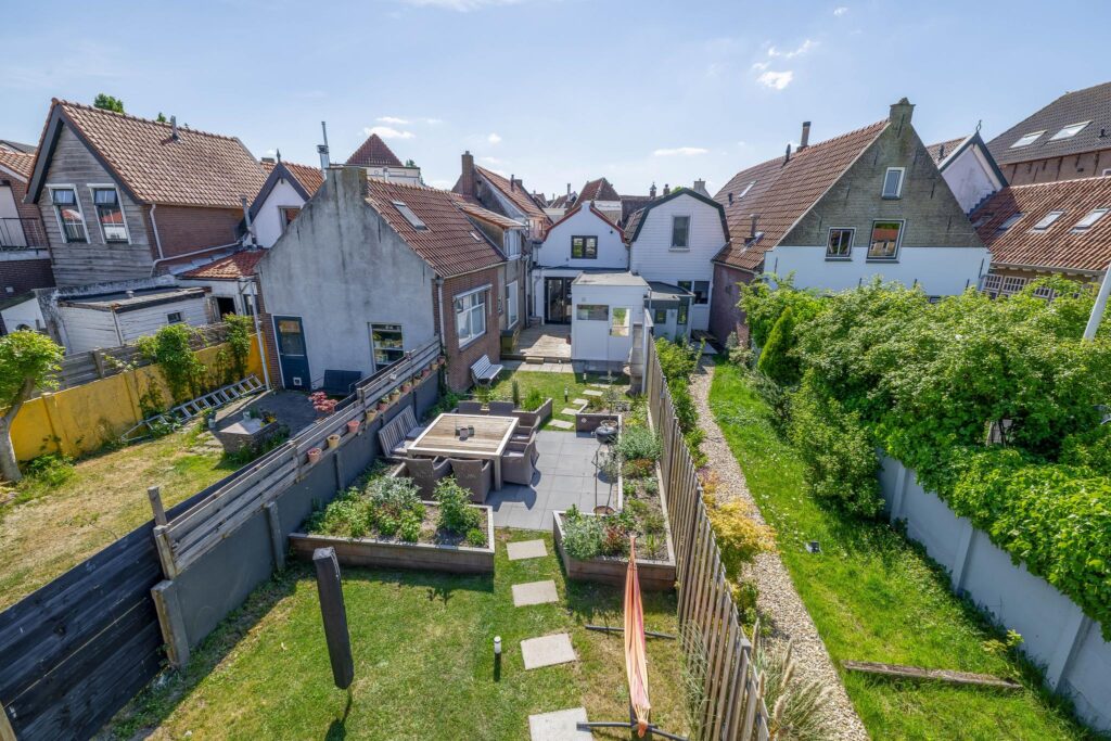 De diepe achtertuin is gelegen op het noordwesten en voorzien van bestrating, beplanting en gazon. Het terras geeft de mogelijkheid om met vrienden of familie heerlijk buiten te vertoeven. Een houten berging staat achterin de tuin en ook is er een achterom middels een poort.