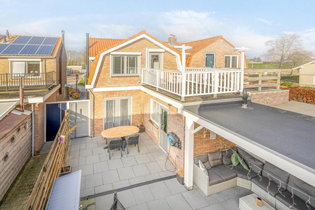 De achtertuin, gelegen op het zuiden, is geheel betegelt en voorzien van een prachtige overkapping. De overkapping is robuust uitgevoerd waarin het heerlijk vertoeven is. De schutting rondom zorgt voor veel privacy. Aan het einde van de tuin staat de berging/schuur met zolder. De tuin is via de zijkant van de woning bereikbaar.