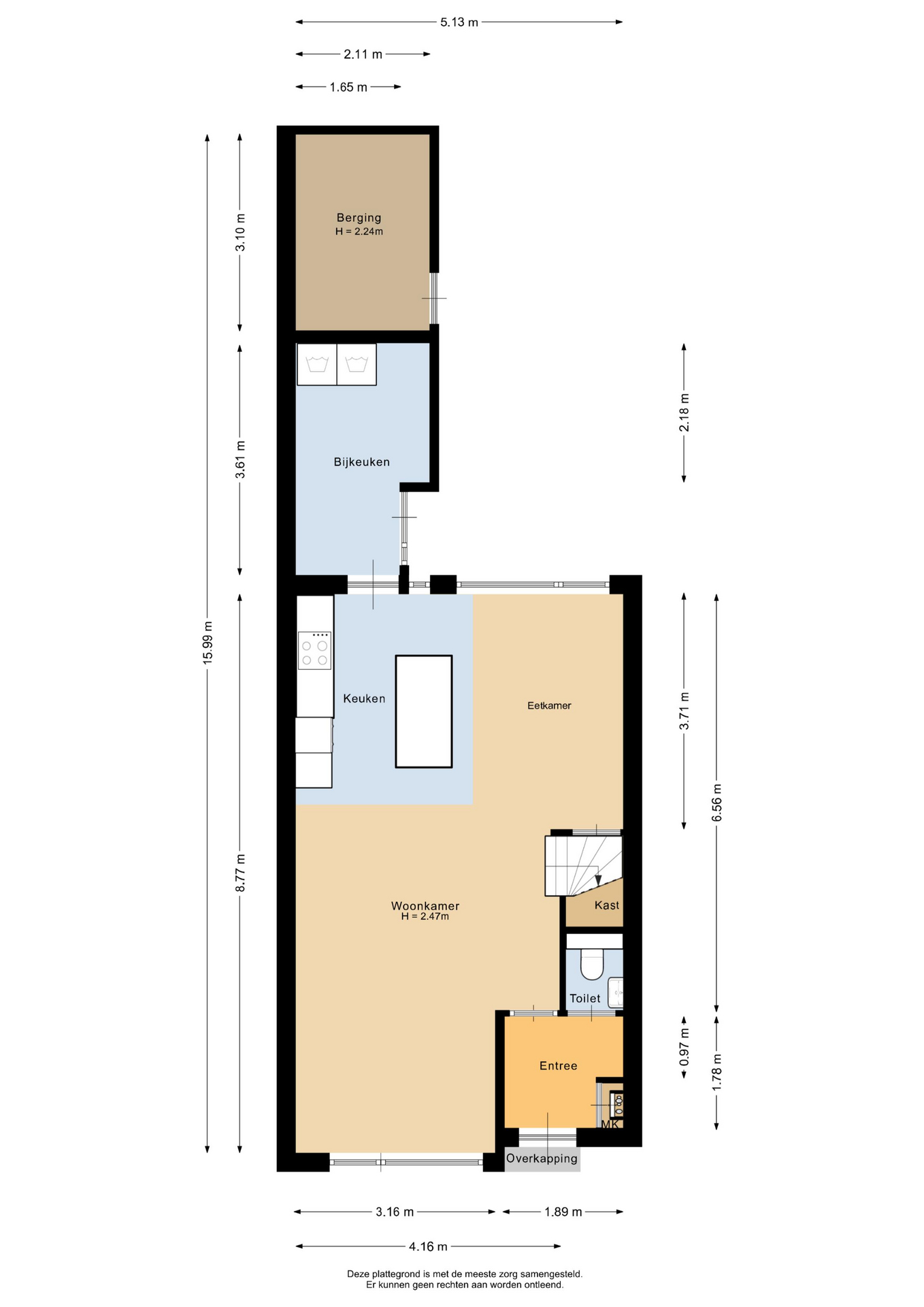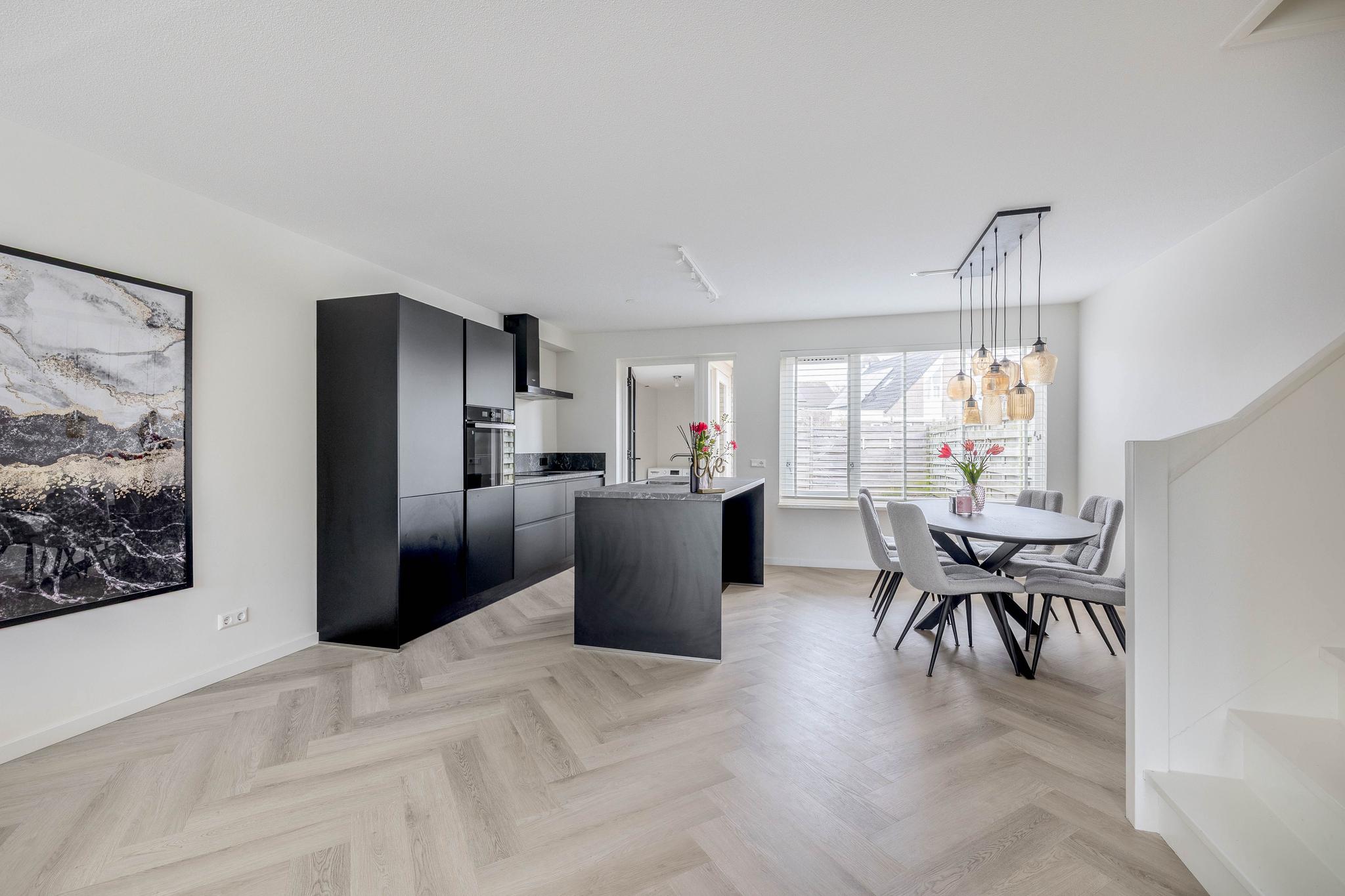 Via de entreehal, met meterkast en toilet, is de woon-/eetkamer bereikbaar. De woonkamer, aan de voorzijde van de woning gelegen, is voorzien van een mooie visgraat PVC vloer met vloerverwarming. De grote ramen zorgen voor veel natuurlijke lichtinval. In het verlengde van de woonkamer is de eetkamer gesitueerd. Tussen de woon- en eetkamer bevindt zich de trap naar de eerste verdieping. Vanuit de woon- en eetkamer heeft u toegang tot de open keuken. De mooie, greeploze keuken is voorzien van veel opbergruimte, een spoeleiland, een marmerlook keukenblad en diverse apparatuur: kookplaat, afzuigkap, oven, koel-/vriescombinatie en vaatwasser. Vanuit de keuken is de achtergelegen bijkeuken toegankelijk. De ruime bijkeuken is voorzien van witgoedaansluitingen en de deur naar de tuin.