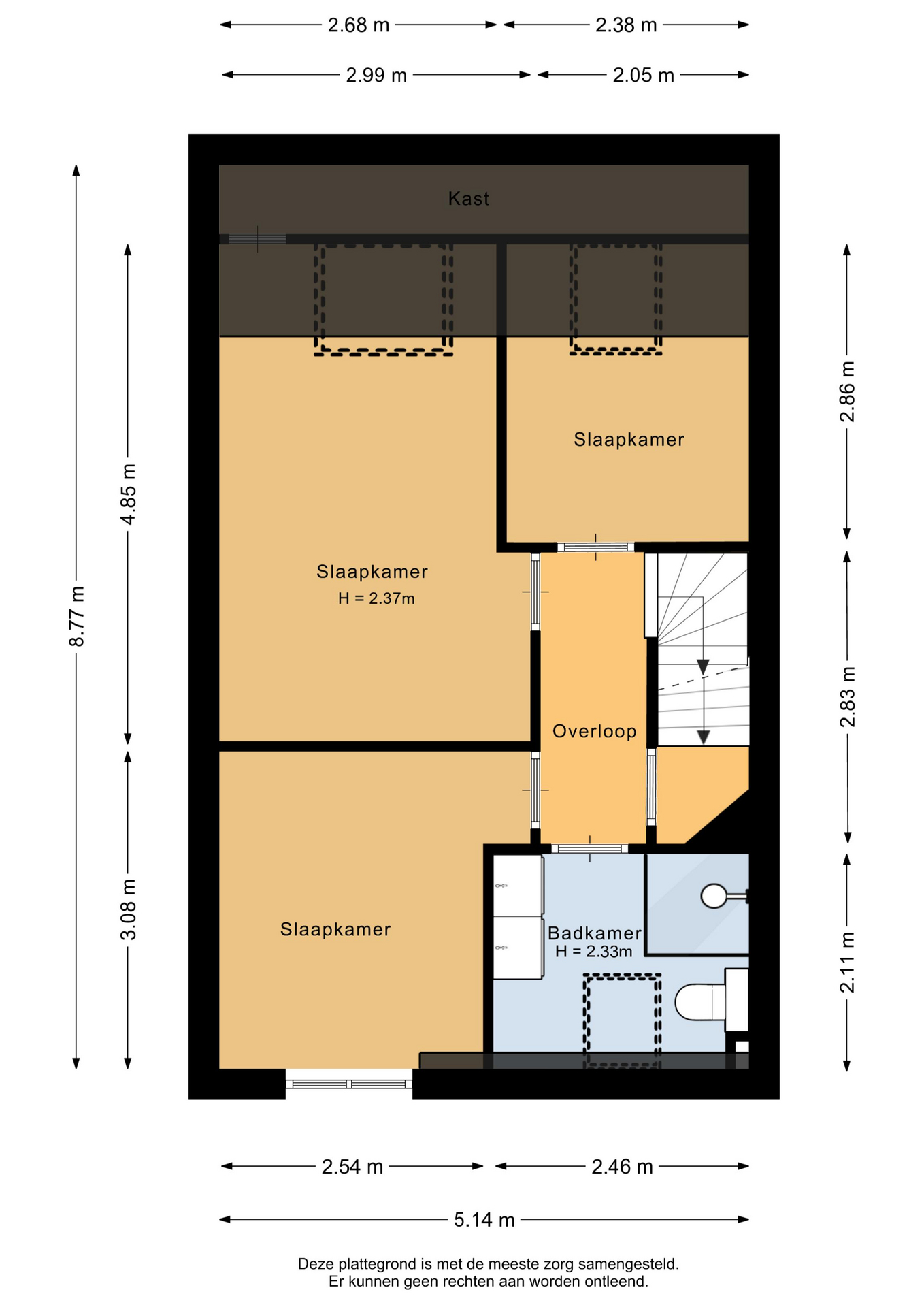 De overloop geeft toegang tot drie slaapkamers en de badkamer. De slaapkamers zijn voorzien van een PVC vloer. De slaapkamer rechts achter heeft een dakraam dat voor veel lichtinval zorgt. De master bedroom, links achter, is voorzien van een groot dakraam, berging onder het schuine dak en een airco. De met marmerlook betegelde, mooie badkamer is voorzien van een douche, een dubbele wastafel met ronde spiegels met verwarming en licht, een designradiator, een toilet en een dakraam.