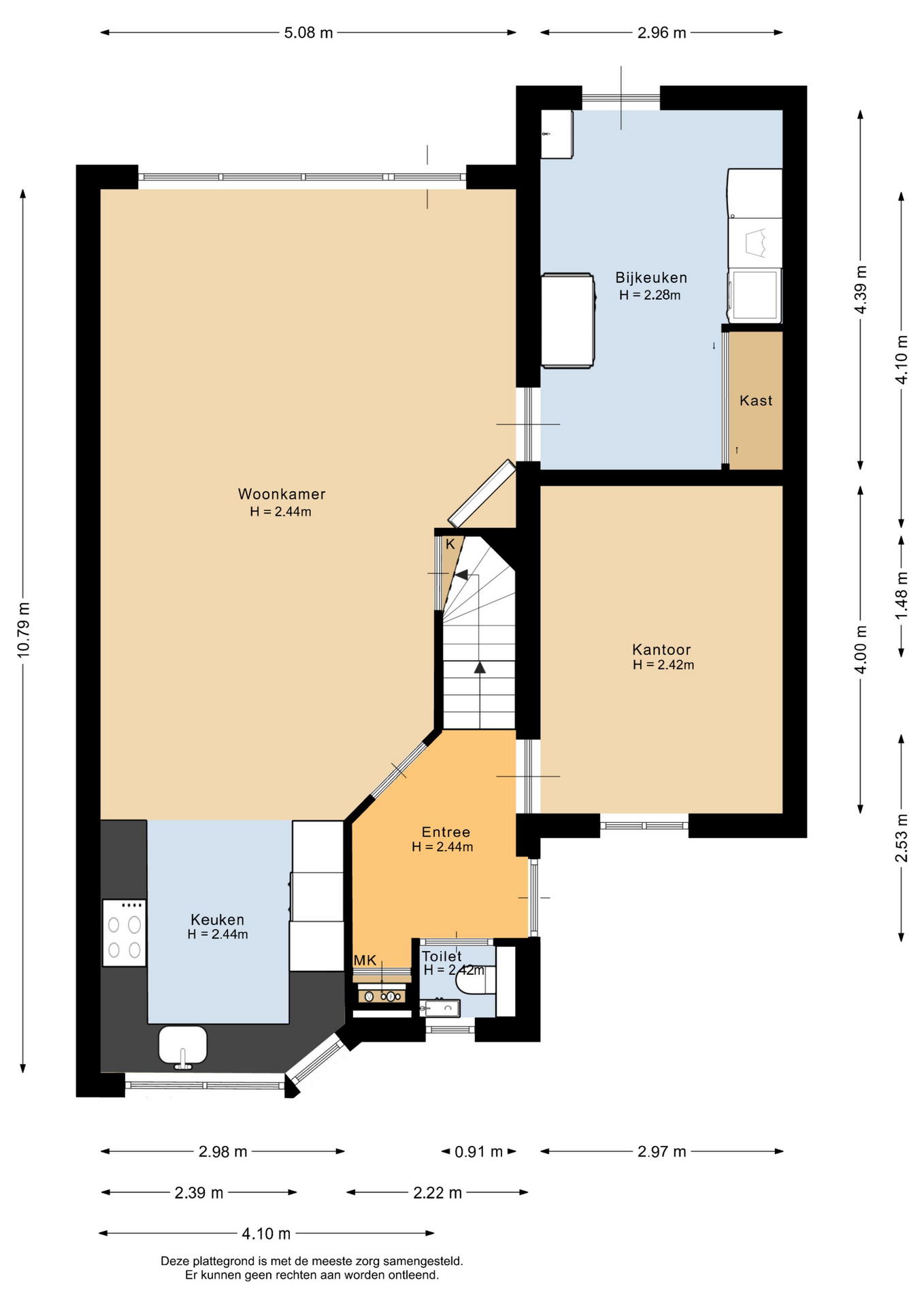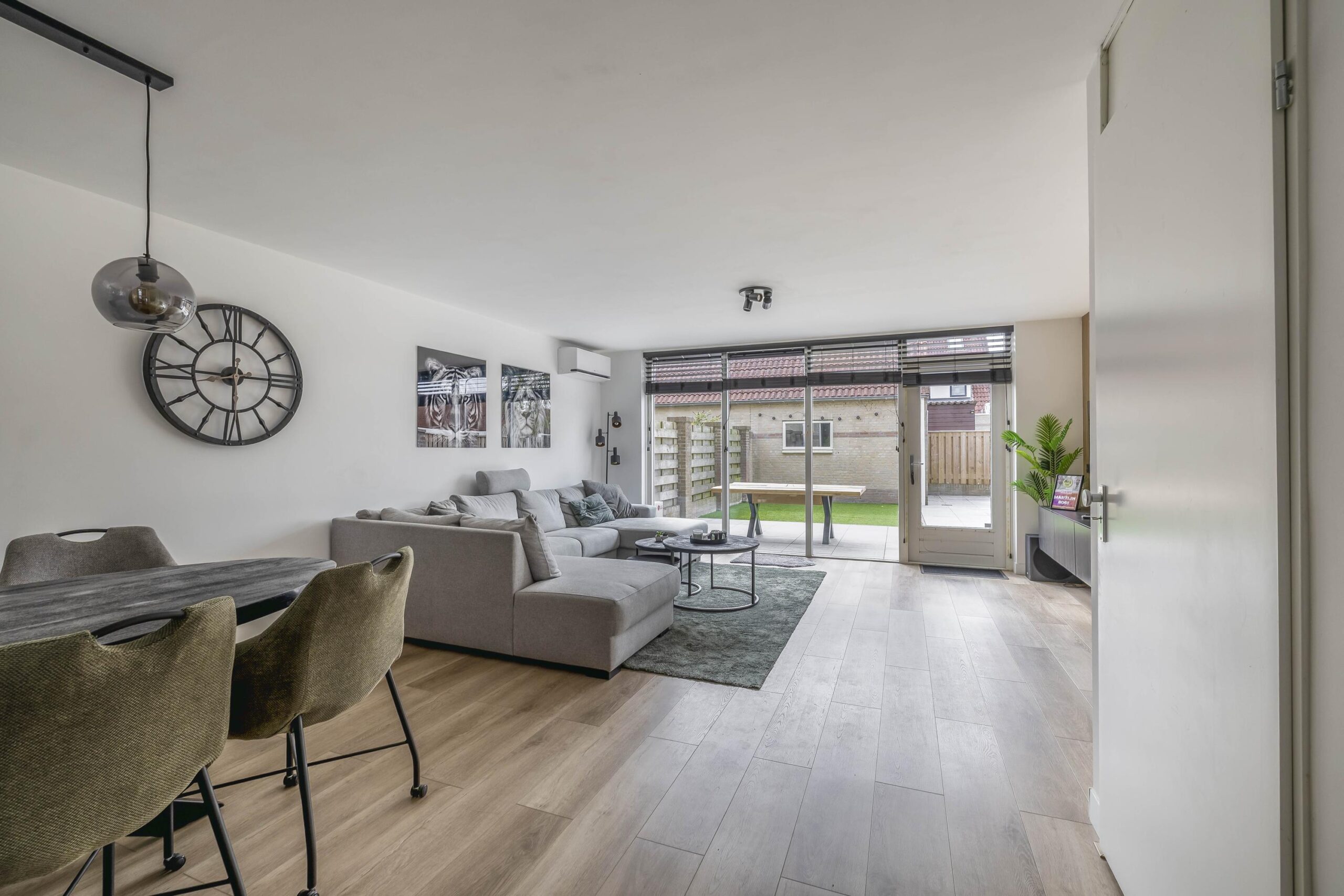 Via de entreehal, met toilet en meterkast, stap je binnen in de lichte en ruime woonkamer. De grote ramen van vloer tot plafond laten het daglicht prachtig naar binnen stromen en geven de ruimte een open en luchtige sfeer. Aan de voorzijde bevindt zich de moderne open keuken, compleet uitgerust met kookplaat met geïntegreerde afzuiging, combi-oven, koelkast, vaatwasser en een Quooker. Alles is stijlvol afgewerkt en praktisch ingedeeld, zodat koken hier echt een plezier is. Grenzend aan de woonkamer ligt de bijkeuken met witgoedaansluitingen en toegang tot de tuin. Aan de voorzijde bevindt zich daarnaast een kantoor – ideaal om rustig te werken of in te richten naar eigen wens.