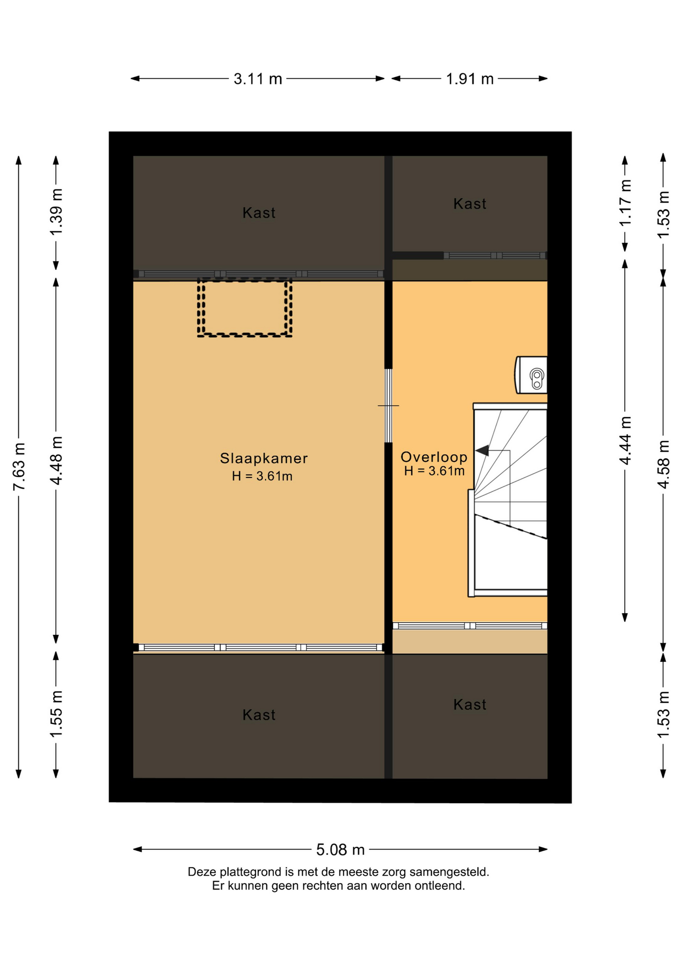 Via een vaste trap bereik je tweede verdieping met de vierde slaapkamer – licht en ruim dankzij het grote dakraam. Achter de knieschotten is volop bergruimte beschikbaar. Op de overloop staat de CV-ketel opgesteld.