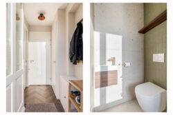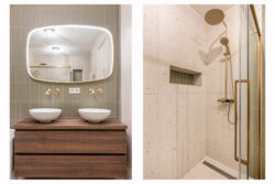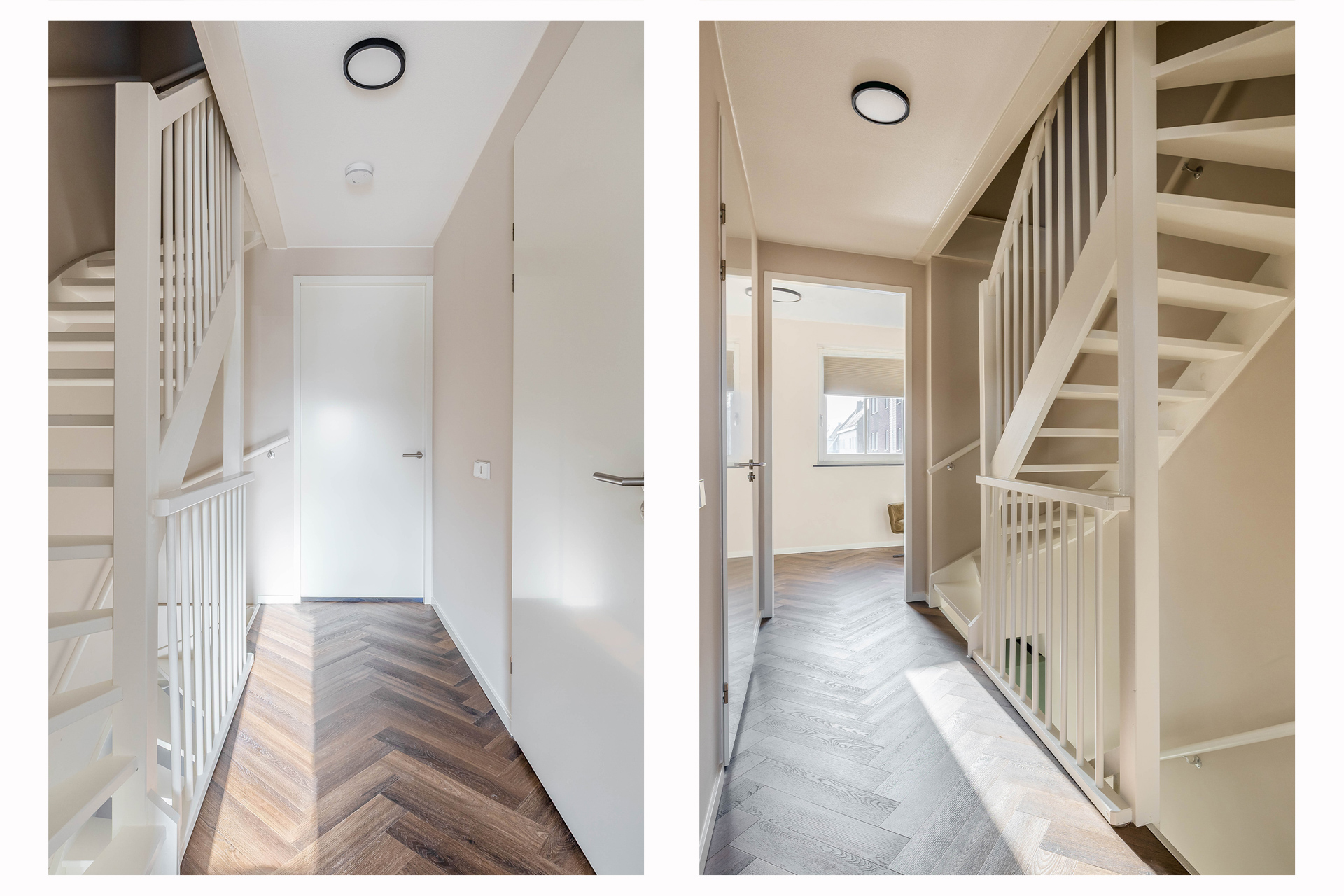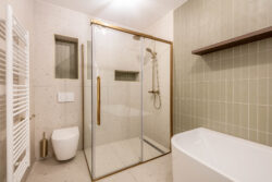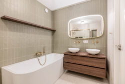 Op de eerste verdieping bevinden zich twee ruime slaapkamers en de badkamer. De kamers zijn praktisch in te delen en genieten van veel daglicht. De royale moderne badkamer met gouden details is compleet uitgevoerd met een ligbad, inloopdouche met regendouche, dubbele wastafel, toilet en designradiator. Een comfortabele en verzorgde ruimte waar je de dag ontspannen begint of afsluit. De gehele eerste verdieping is voorzien van vloerverwarming.