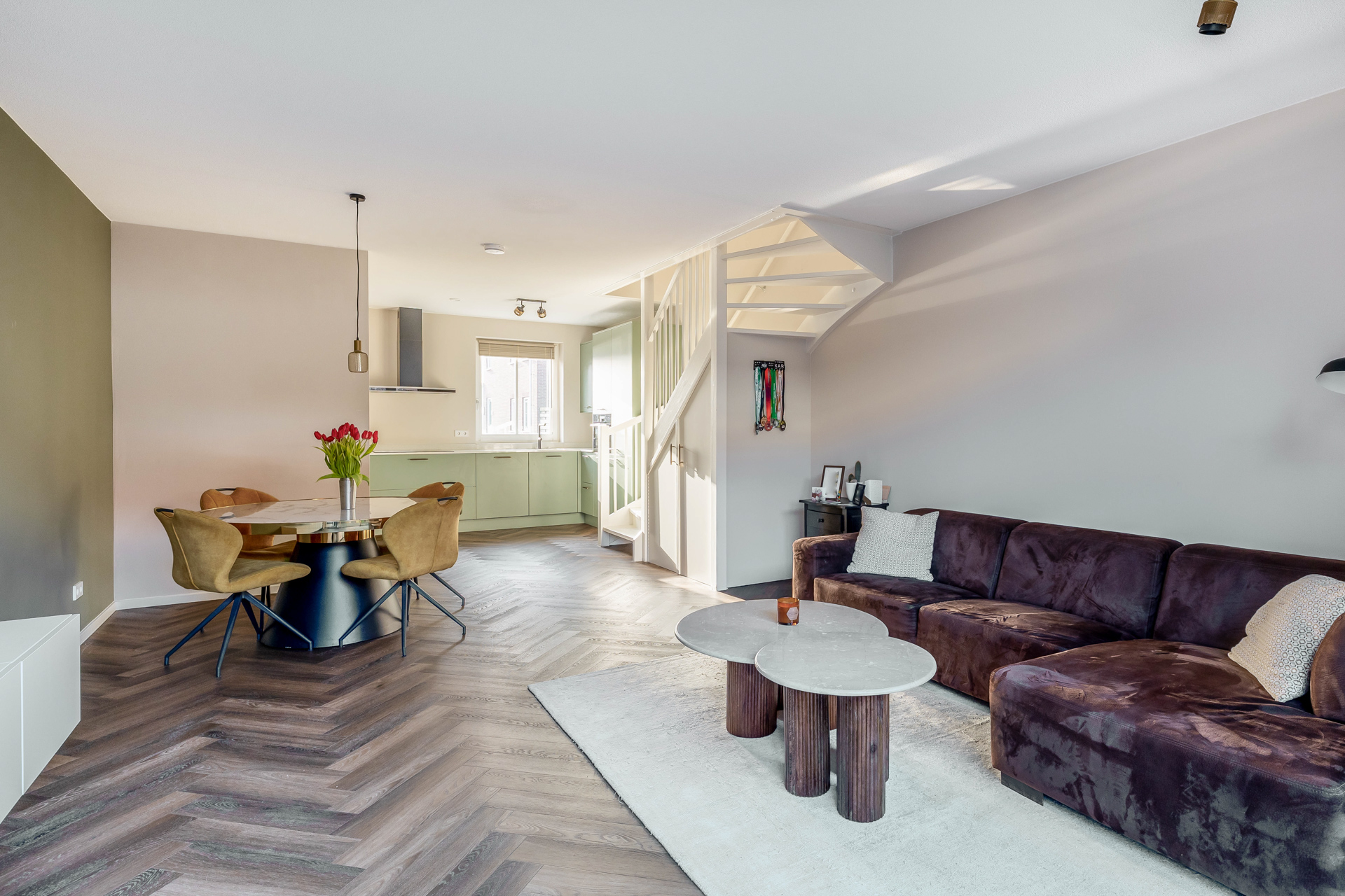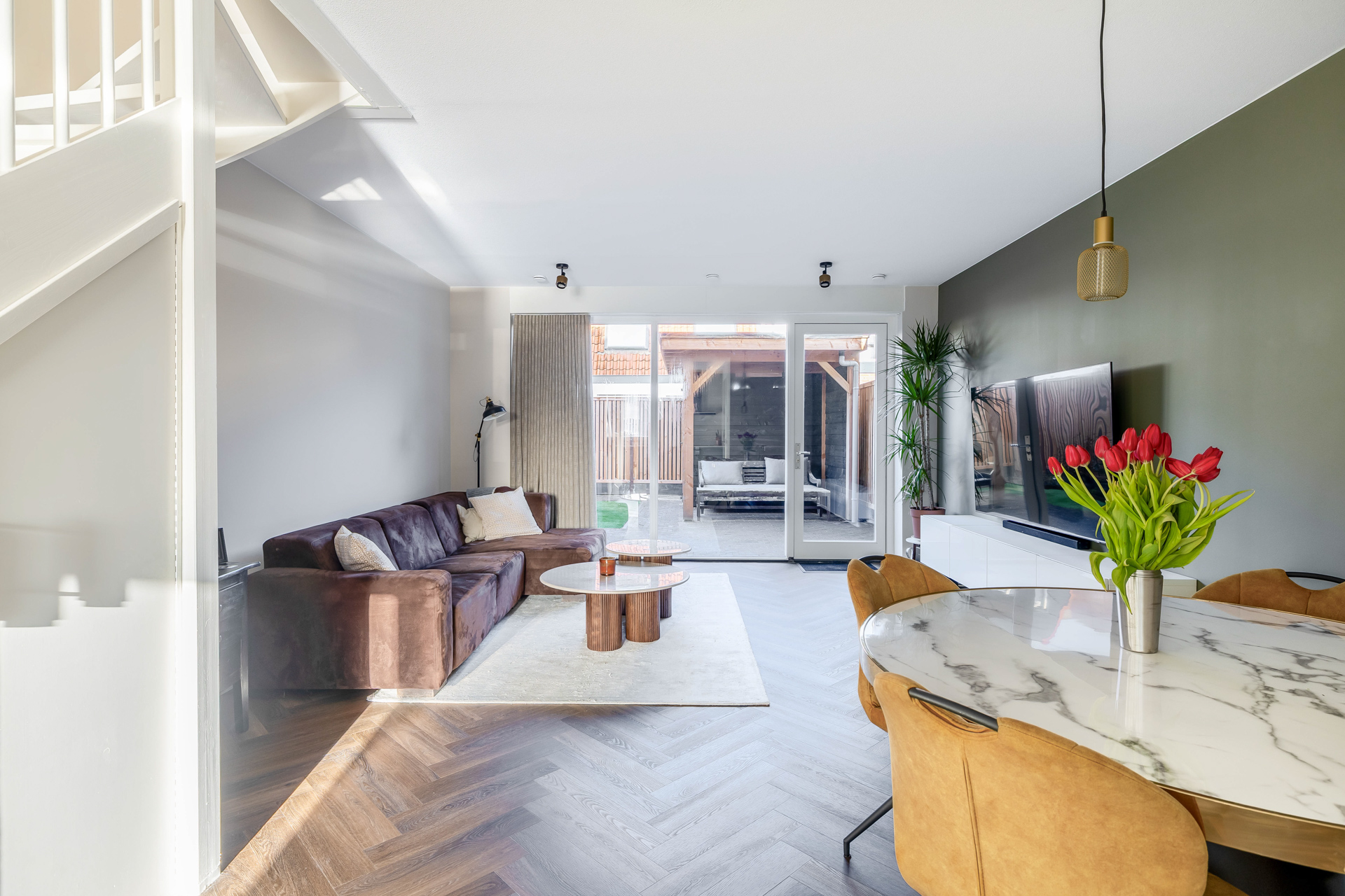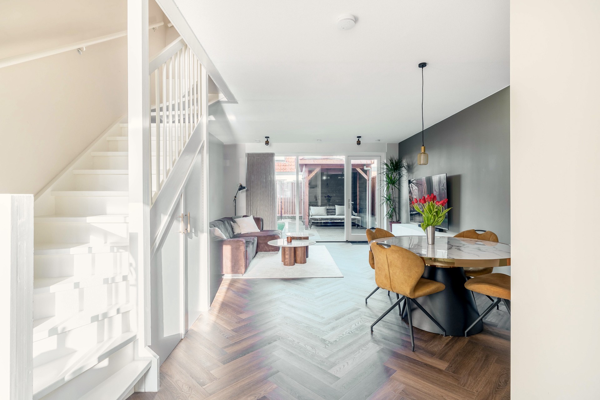 Je betreedt de woning in een verzorgde entree met toegang tot het toilet en via de open keuken kom je in de woonkamer. De woonkamer van circa 32 m² is royaal en heerlijk licht en geeft toegang tot de tuin wat binnen en buiten mooi in elkaar laat overlopen. De trap in de woonkamer geeft het geheel een speels karakter. Aan de voorzijde bevindt zich de strakke en moderne open keuken. Een fijne plek om te koken en in contact te blijven met familie of gasten. De gehele begane grond is voorzien van vloerverwarming, wat zorgt voor een aangenaam en gelijkmatig binnenklimaat.