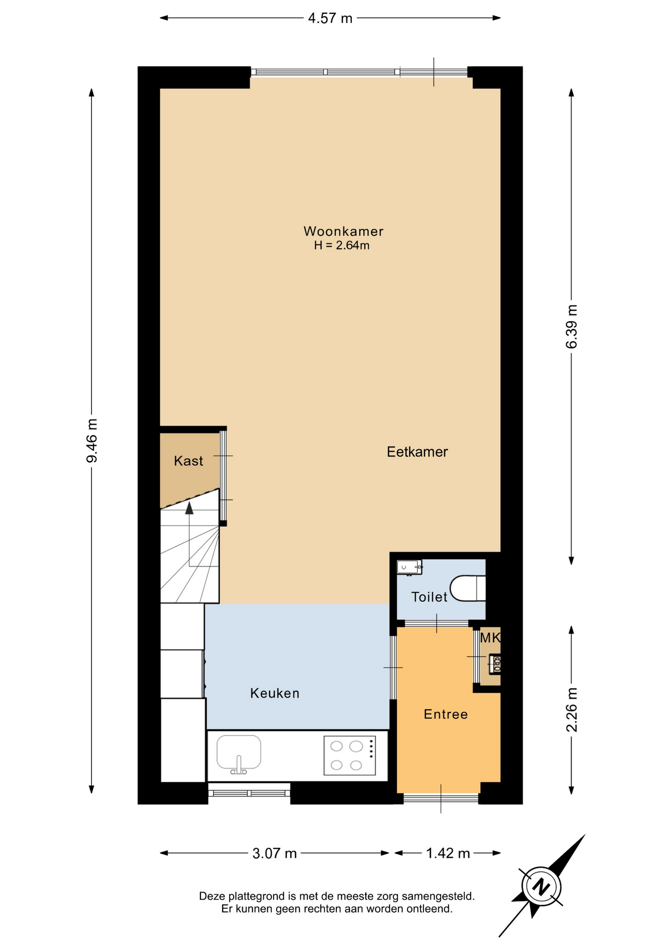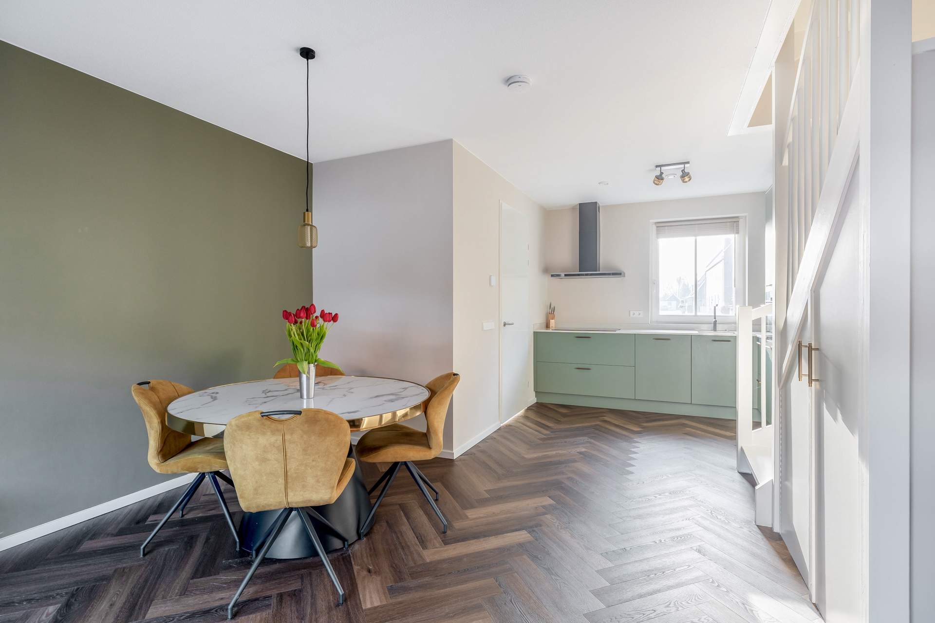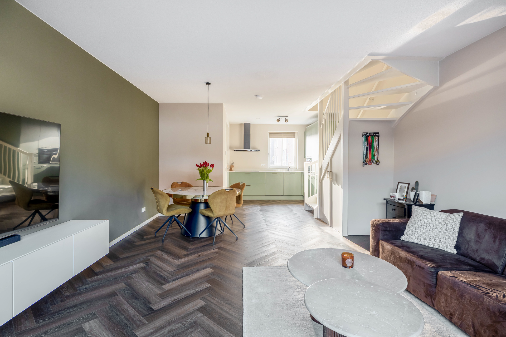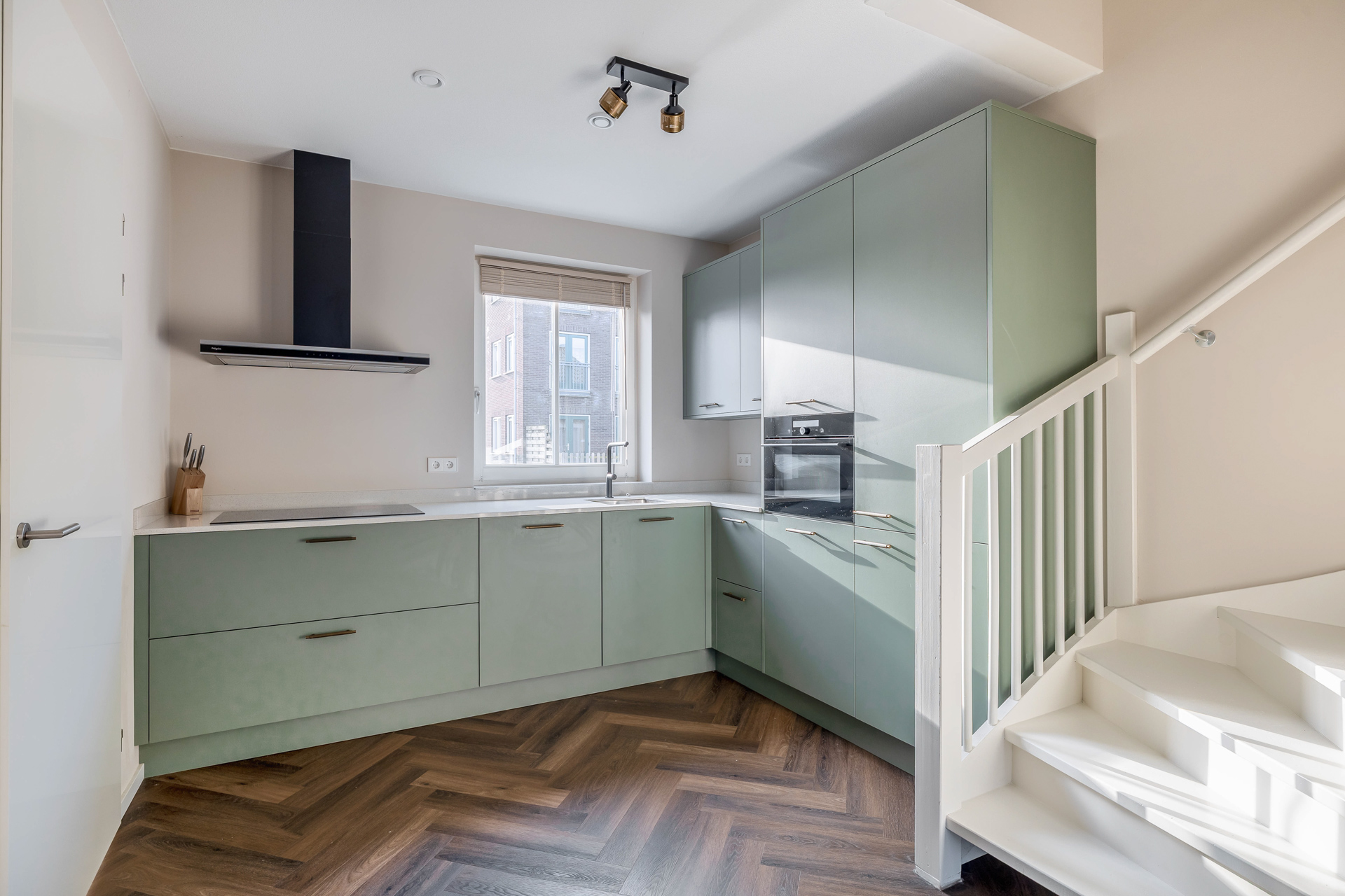 Je betreedt de woning in een verzorgde entree met toegang tot het toilet en via de open keuken kom je in de woonkamer. De woonkamer van circa 32 m² is royaal en heerlijk licht en geeft toegang tot de tuin wat binnen en buiten mooi in elkaar laat overlopen. De trap in de woonkamer geeft het geheel een speels karakter. Aan de voorzijde bevindt zich de strakke en moderne open keuken. Een fijne plek om te koken en in contact te blijven met familie of gasten. De gehele begane grond is voorzien van vloerverwarming, wat zorgt voor een aangenaam en gelijkmatig binnenklimaat.