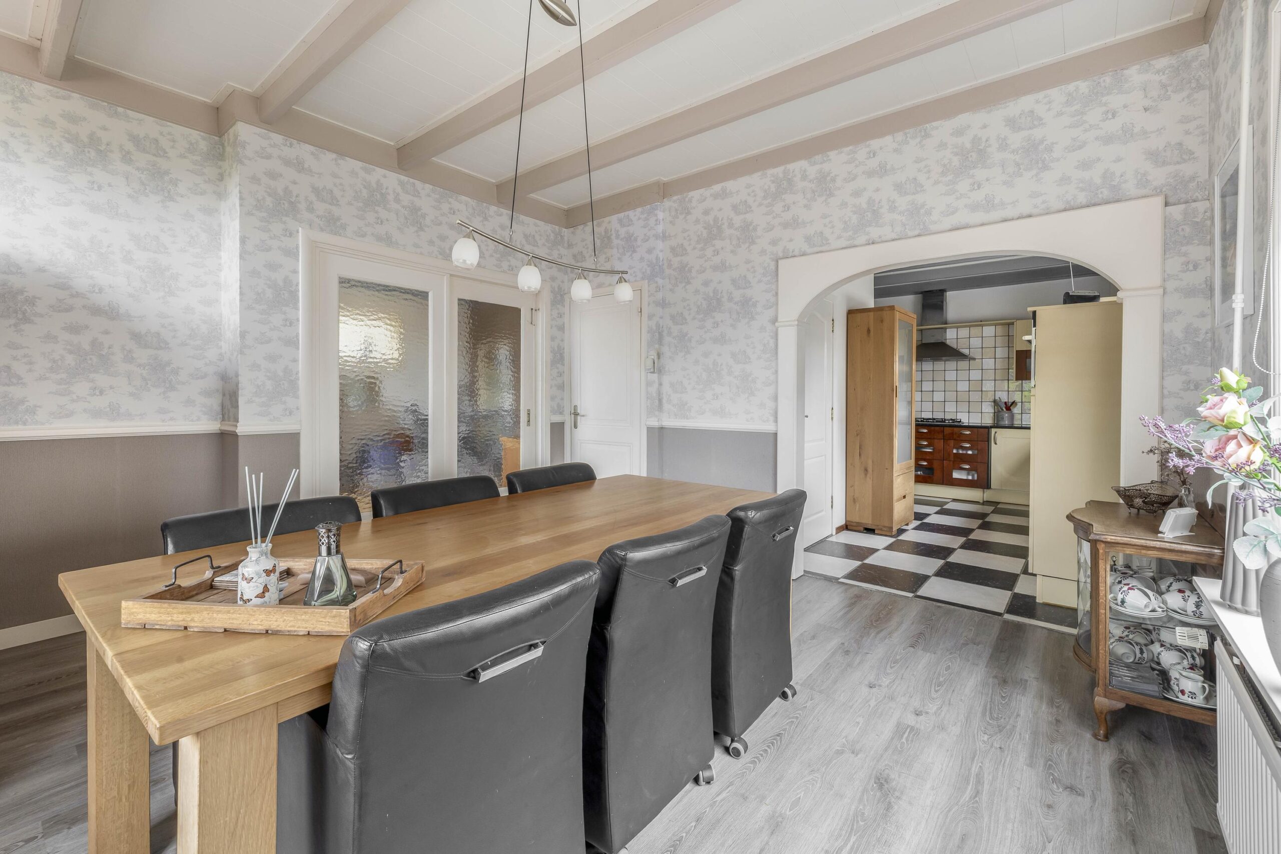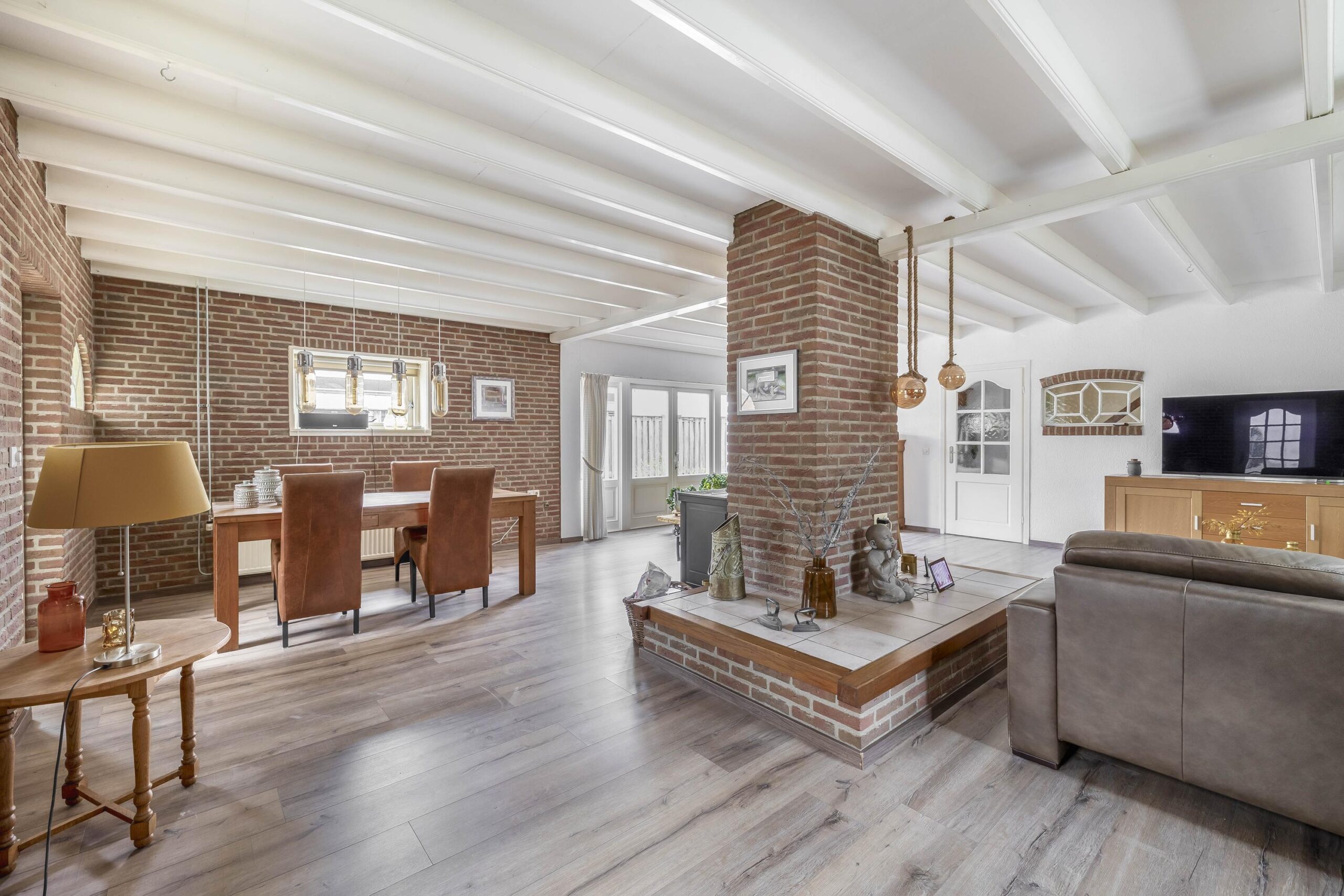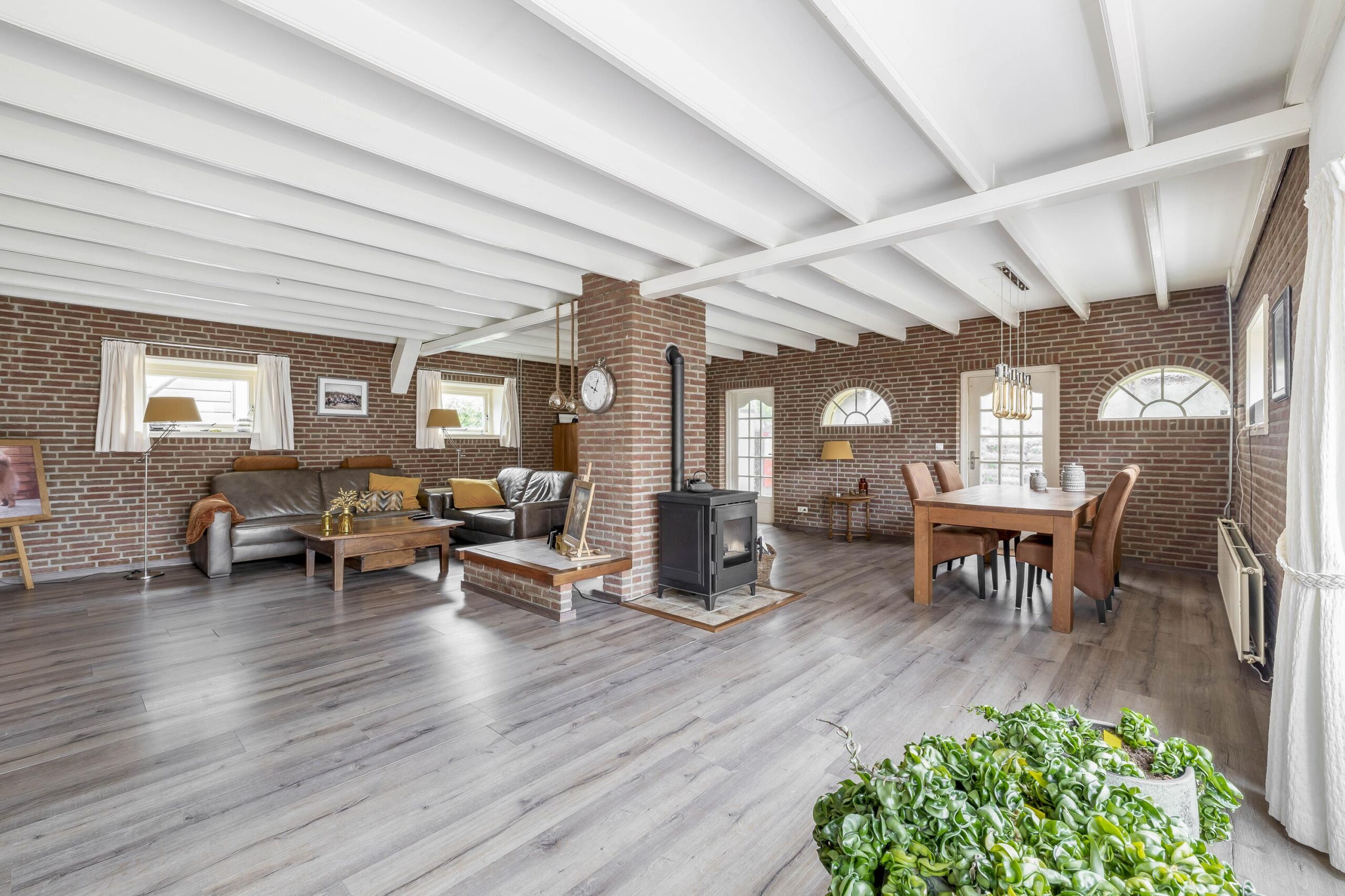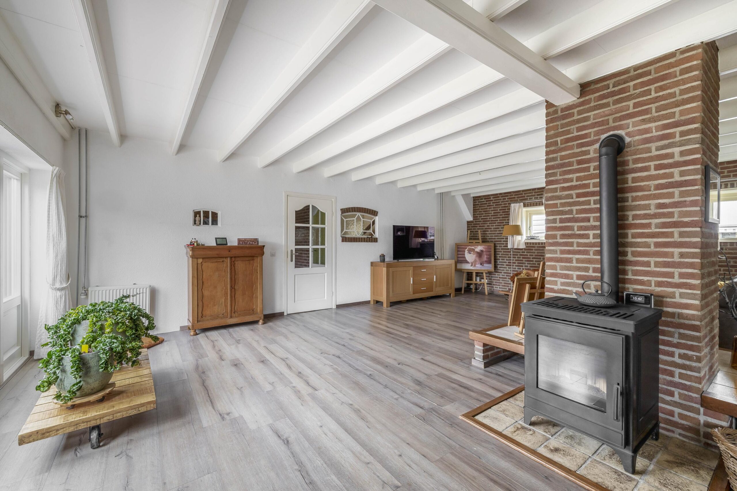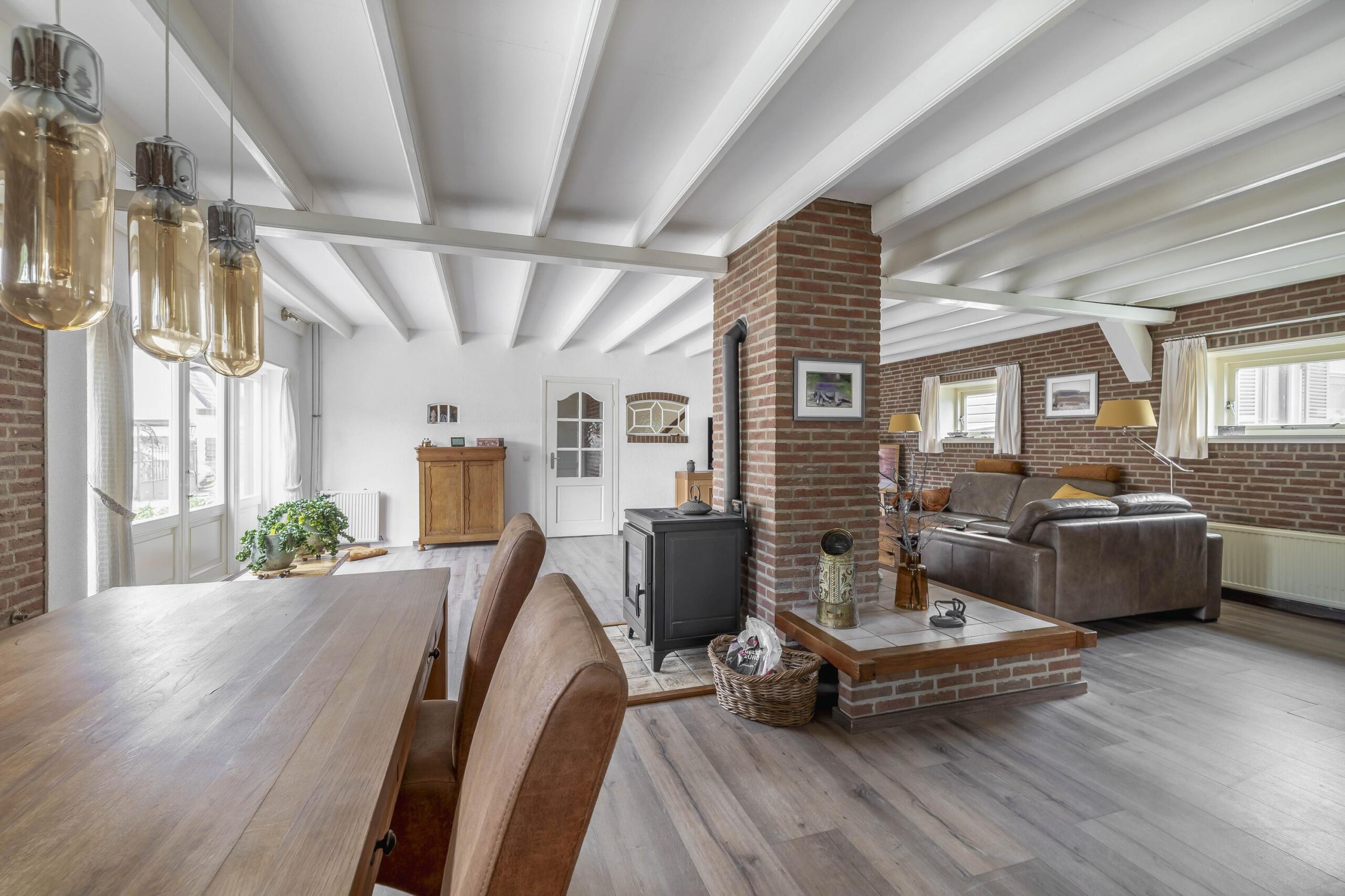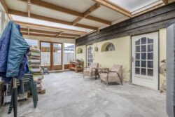 Via de ruime oprit bereikt u de voordeur van deze woning. Vanuit de entreehal stapt u de achterste woonkamer en de landelijke keuken binnen. In de woonkamer zijn de authentieke balken en ramen liefdevol bewaard gebleven. Midden in de ruimte staat de pelletkachel: het warme hart van de kamer, waar het heerlijk vertoeven is tijdens lange avonden. Vanuit de woonkamer loopt u zo de serre in, die nu als opslagruimte wordt gebruikt. Vanuit hier bereikt u binnendoor de achtergelegen garage. De landelijke keuken is volledig uitgerust met apparatuur, waaronder een kookplaat, afzuigkap, combi-oven, koelkast, vriezer en vaatwasser. Vanuit de keuken is er toegang tot de kelder. Via een open doorgang komt u in de eetkamer, een royale plek waar samen dineren een feestje wordt. Aan de voorzijde van de woning vindt u een tweede woonkamer, voorzien van een mooie, authentieke schouw – een ruimte die uitnodigt tot ontspannen momenten in stijl. Vanuit de keuken bereikt u de badkamer, een plek om heerlijk te ontspannen. Deze is compleet uitgerust met een ligbad om in weg te dromen, een ruime inloopdouche met regendouche, een dubbele wastafel, een toilet en een designradiator.