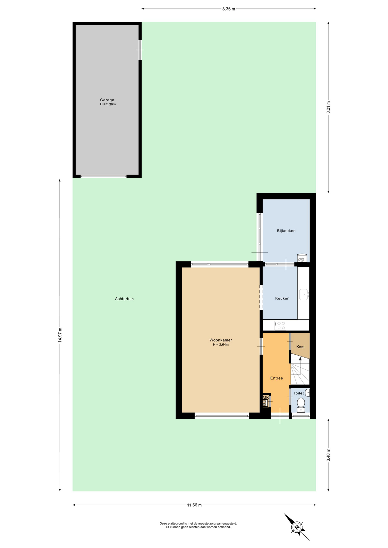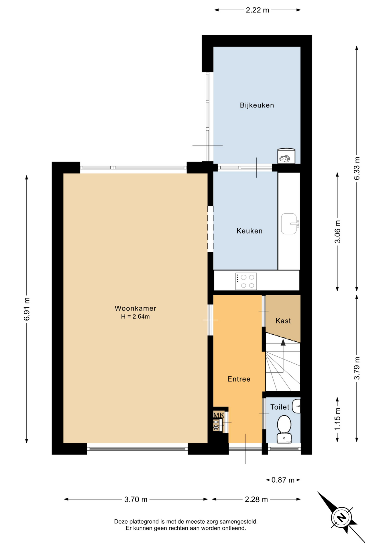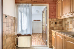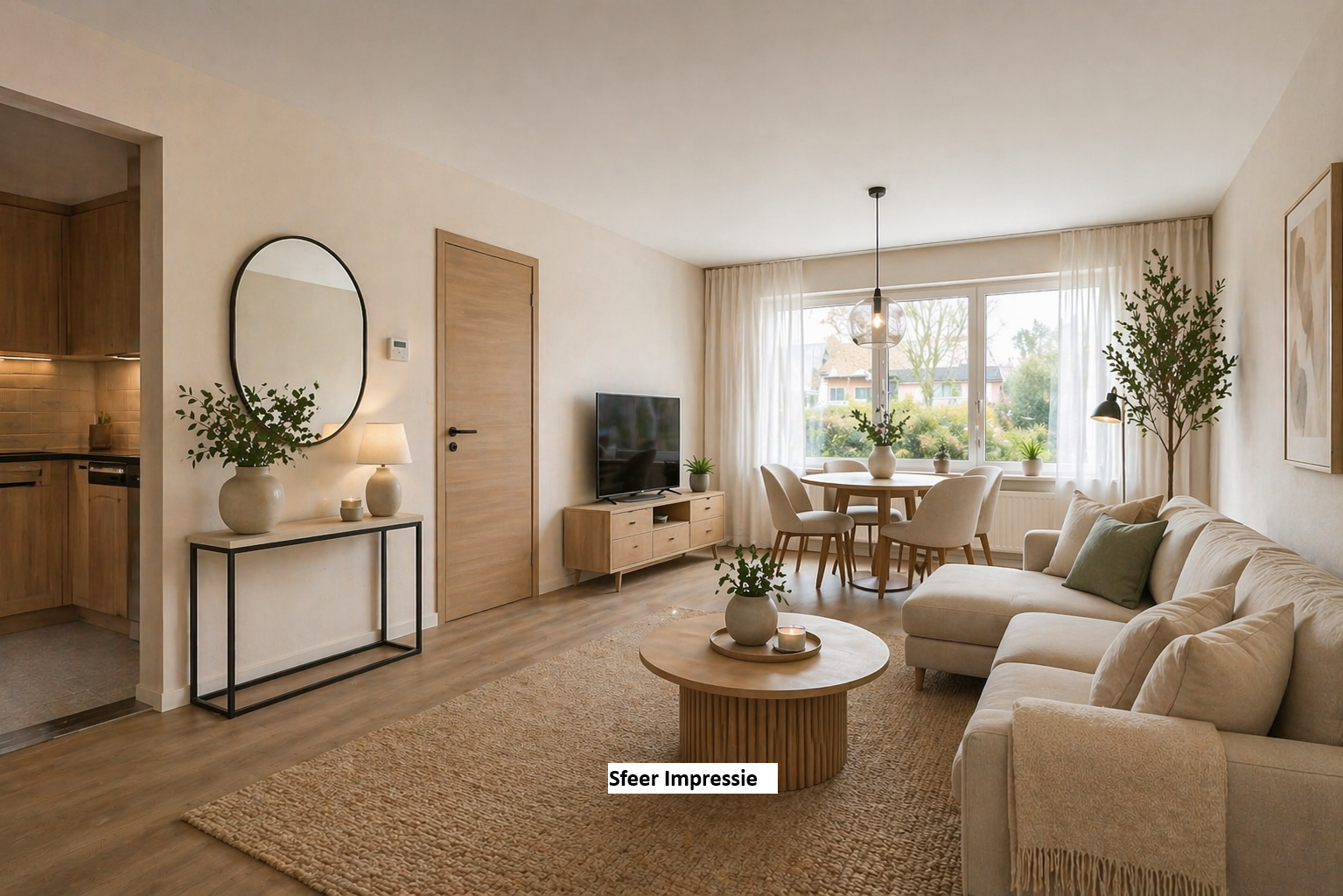 Entree met toegang tot de hal en toilet, waar vandaan de woonkamer en half open keuken bereikbaar zijn. De woonkamer kenmerkt zich door een prettige lichtinval en een functionele indeling met een oppervlakte van circa 26 m². Aansluitend bevindt zich de keuken, compact maar praktisch ingericht en in directe verbinding met de leefruimte, wat zorgt voor een aangename woonbeleving. Vanuit de keuken is tevens de bijkeuken bereikbaar, een praktische ruimte die zich uitstekend leent voor het realiseren van bijvoorbeeld een wasruimte met toegang tot de tuin.