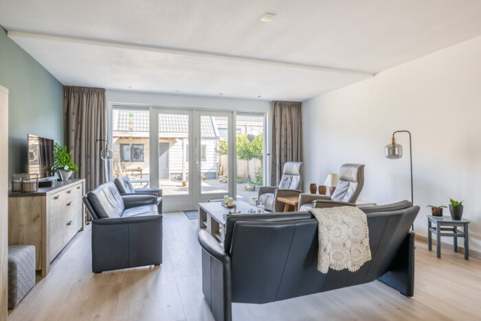 Via de entree met meterkast en toilet betreedt u de woning. De lichte woonkamer vormt het hart van het huis. Dankzij de openslaande deuren naar de tuin geniet u hier van een prachtige lichtinval en een fijne verbinding met buiten.