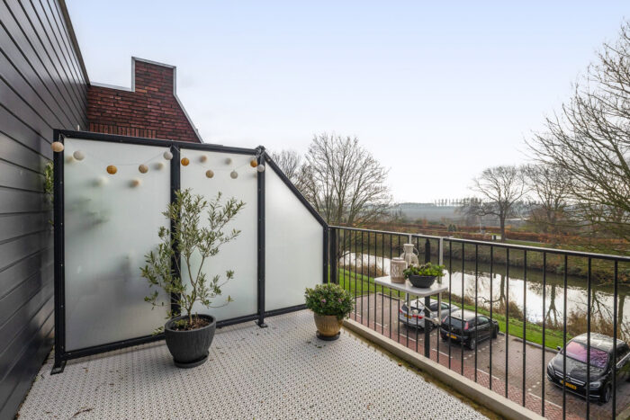 Het balkon, op het zuiden gelegen, is toegankelijk vanuit de woonkamer. Een plek om heerlijk te ontspannen terwijl je uitkijkt over het kabbelende water. De externe berging bevindt zich tussen de twee complexen en biedt praktische opbergruimte. Links van het appartementencomplex is de parkeerplaats, waar je een eigen parkeerplaats hebt.